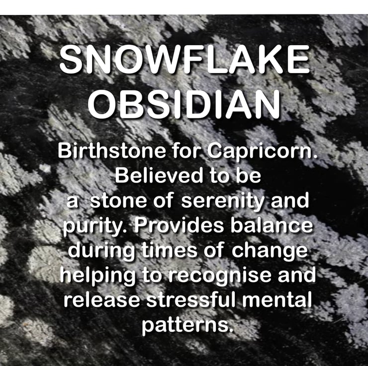 Stone properties - Snowflake Obsidian is associated with purity and balance of the mind, body and spirit. Ideal for anyone intent on improving themselves or becoming better organisers.