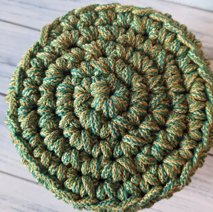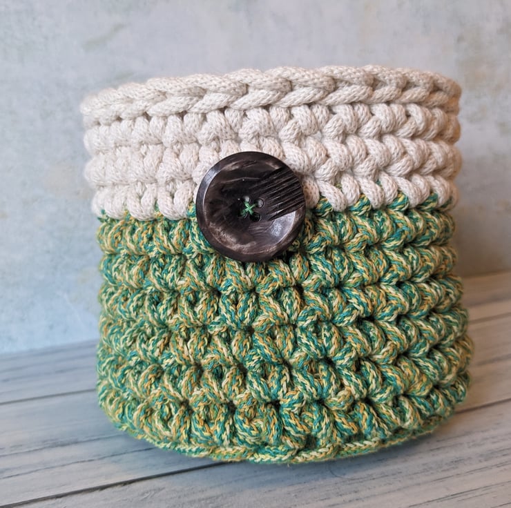 An attractive crocheted plant pot cover or desk tidy, made with premium quality recycled braided cord. I have used a limited edition variegated colour cord, 'Spring', in shades of green and yellow for the base, combined with ecru at the top.