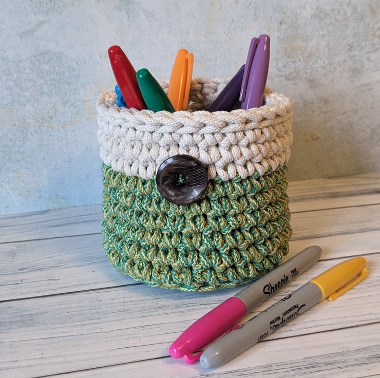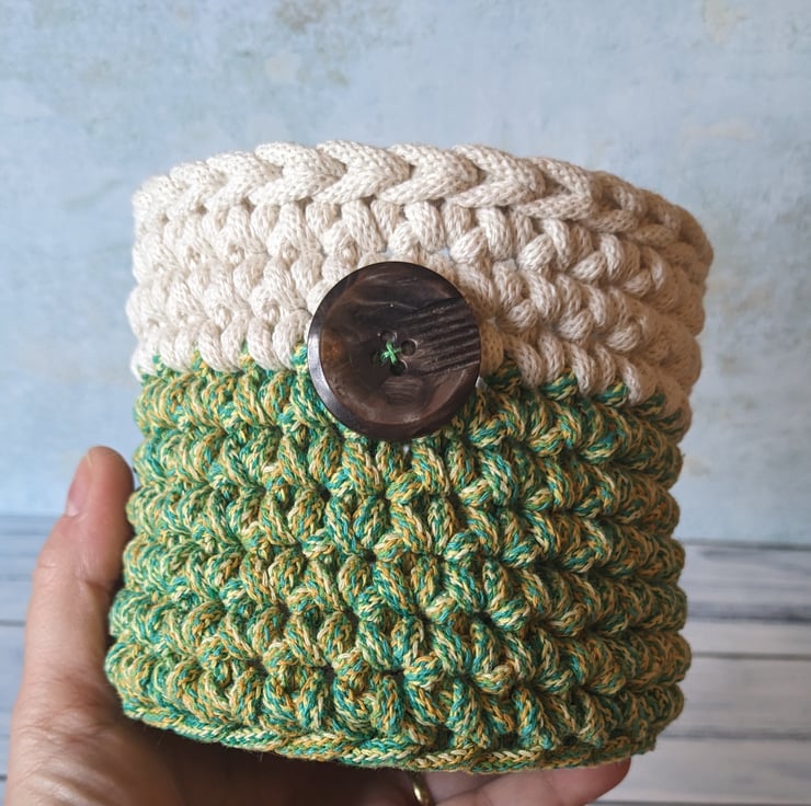 The container is flexible yet keeps its shape and the cord gives great definition to the crochet stitches used to create it. It has a slip stitch crocheted top edge making it both sturdy and decorative. it also features a vintage shiny mottled brown/grey button, hand sewn on the side as a special finishing touch.