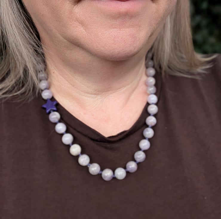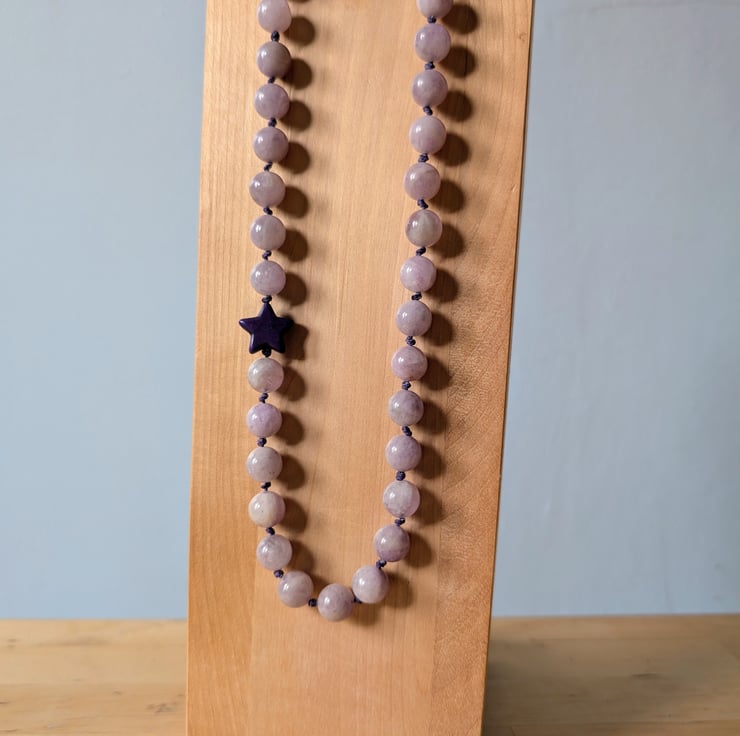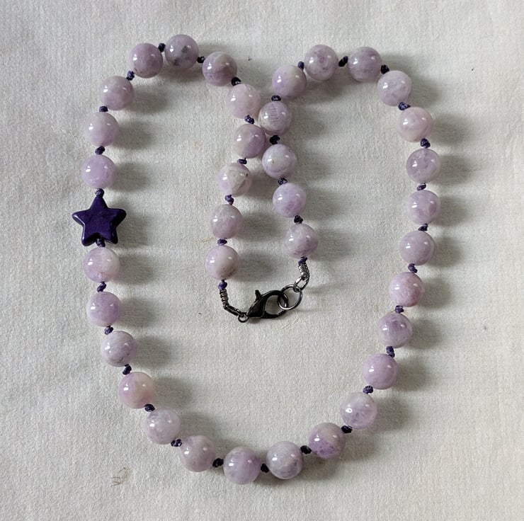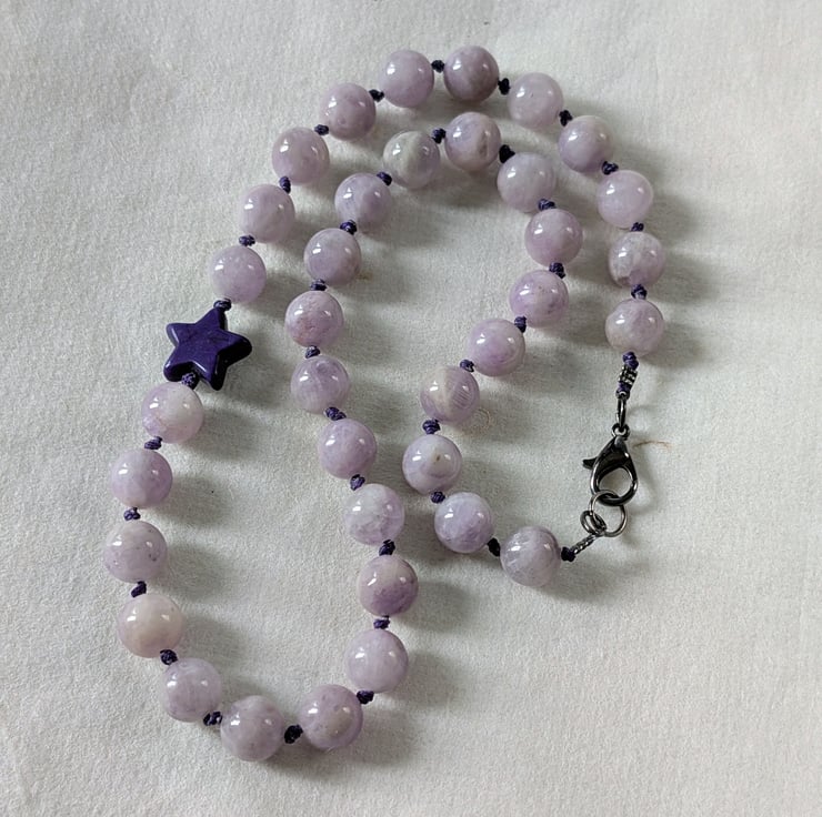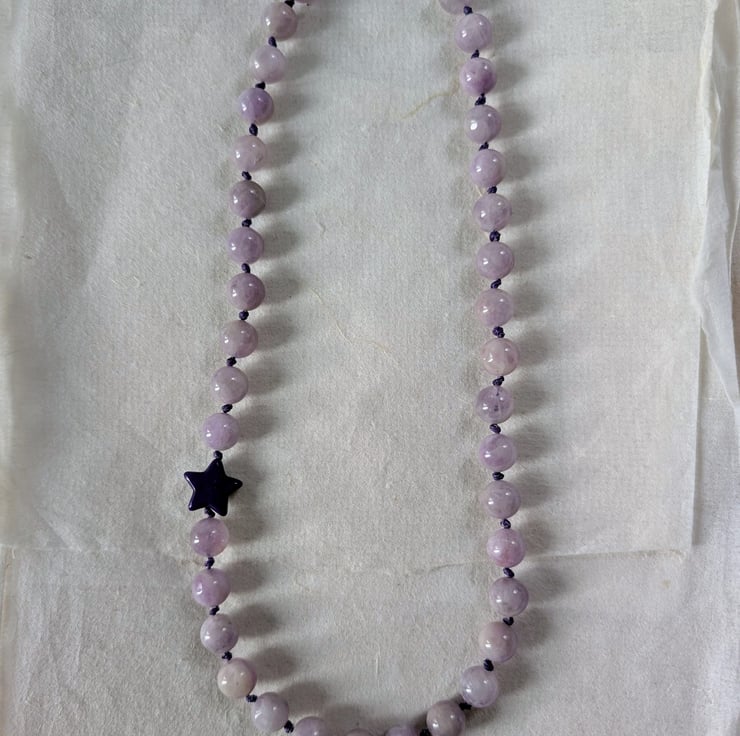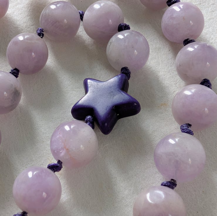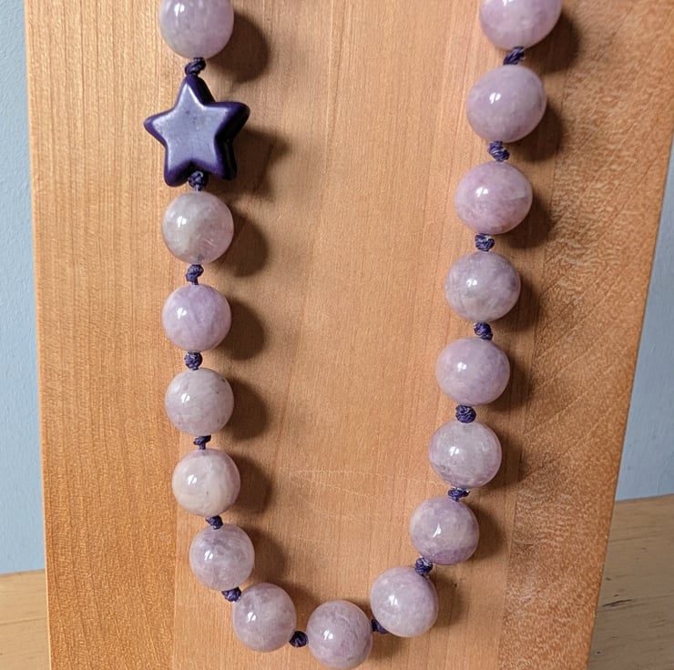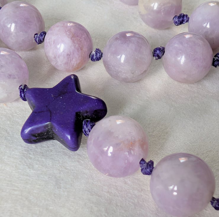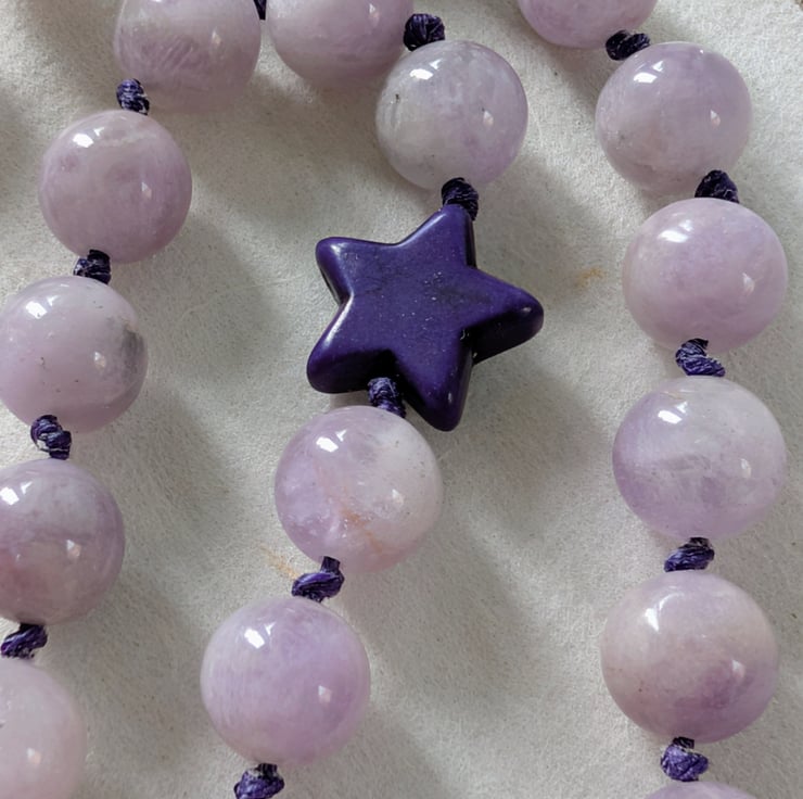 This handmade necklace features 10mm kunzite beads, individually knotted onto cotton cord for strength and a relaxed, tactile finish. A single dark purple howlite star sits slightly off-centre, adding a playful detail without overpowering the design.