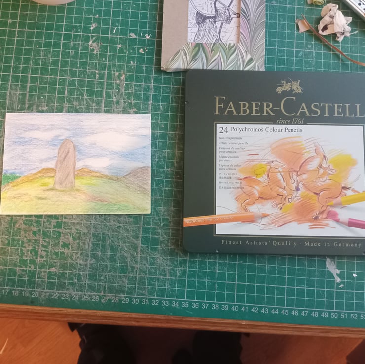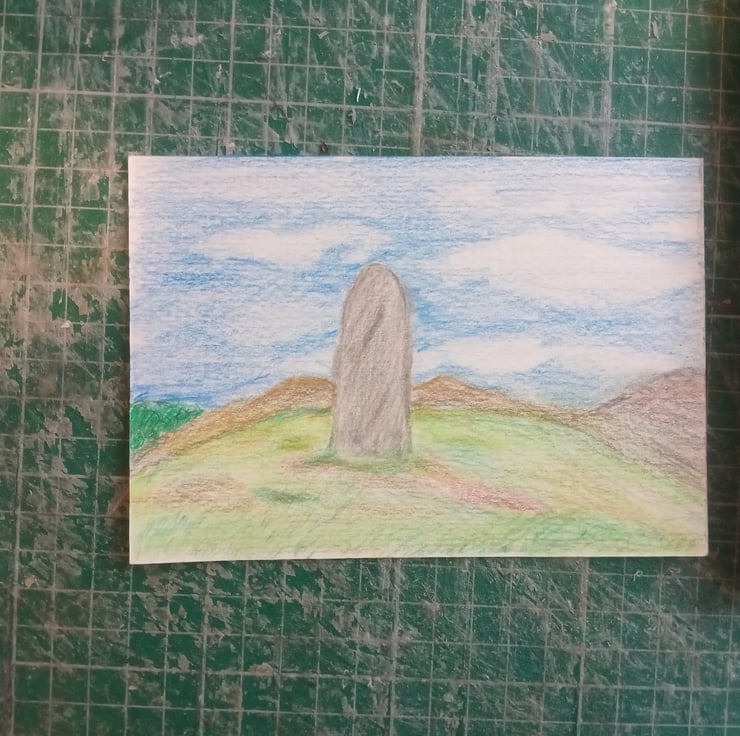 Coloured pencil original art. A6 landscape standing stone