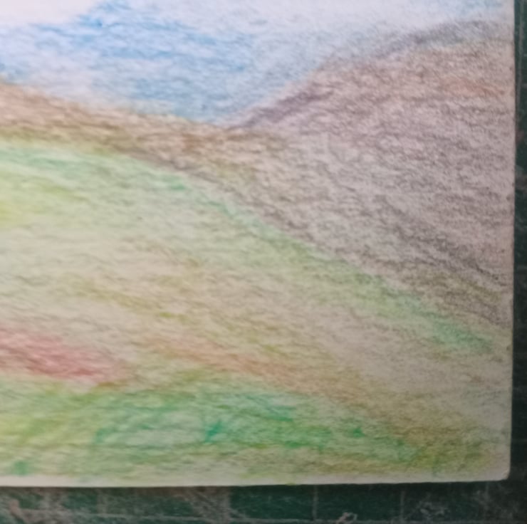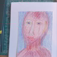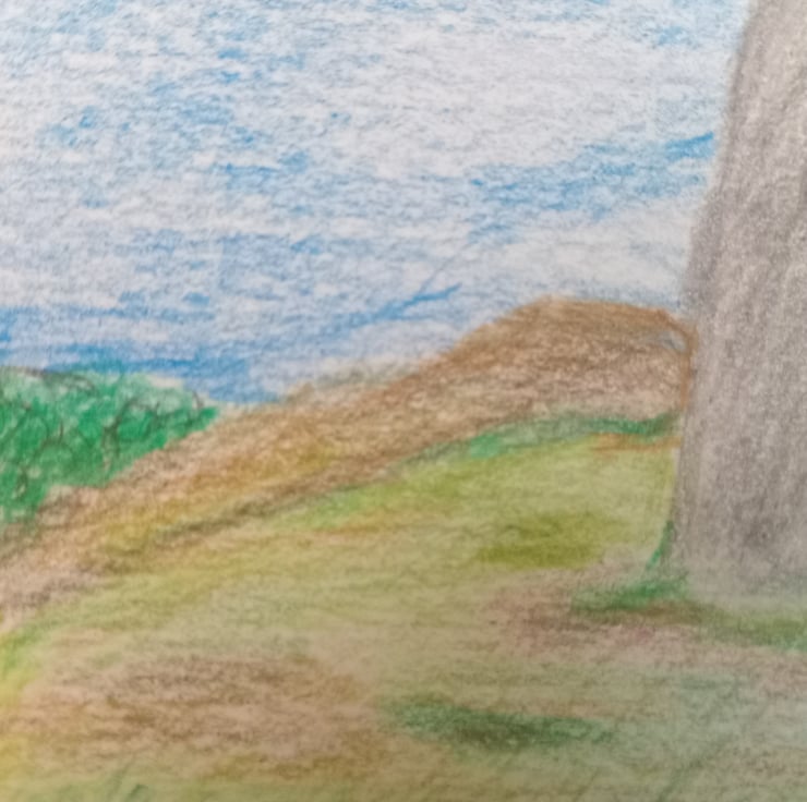 Coloured pencil original art. A6 landscape standing stone. Naive illustration