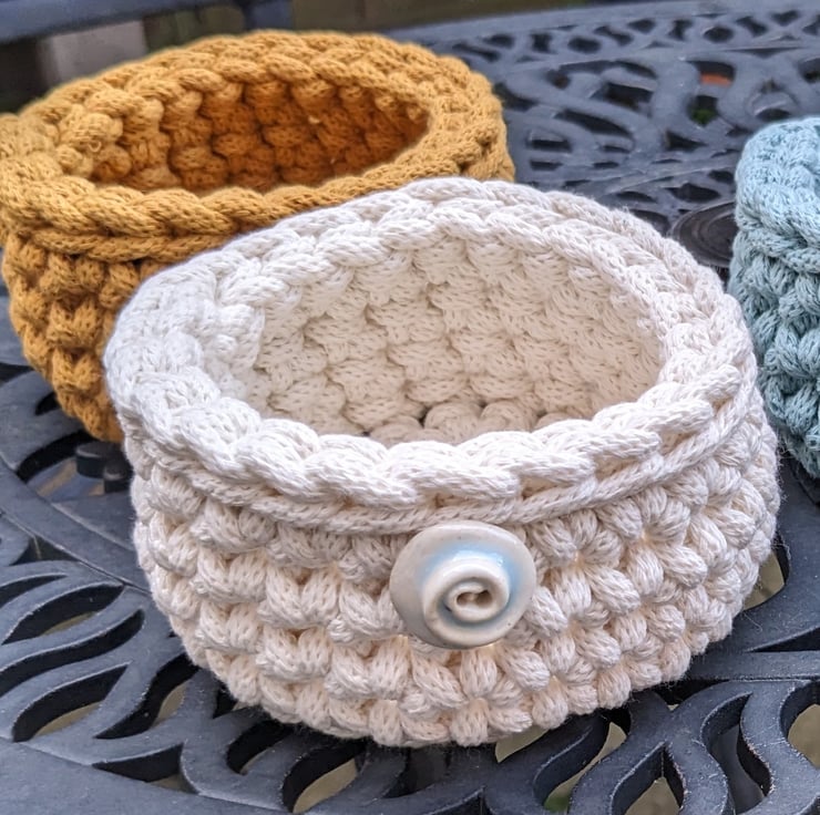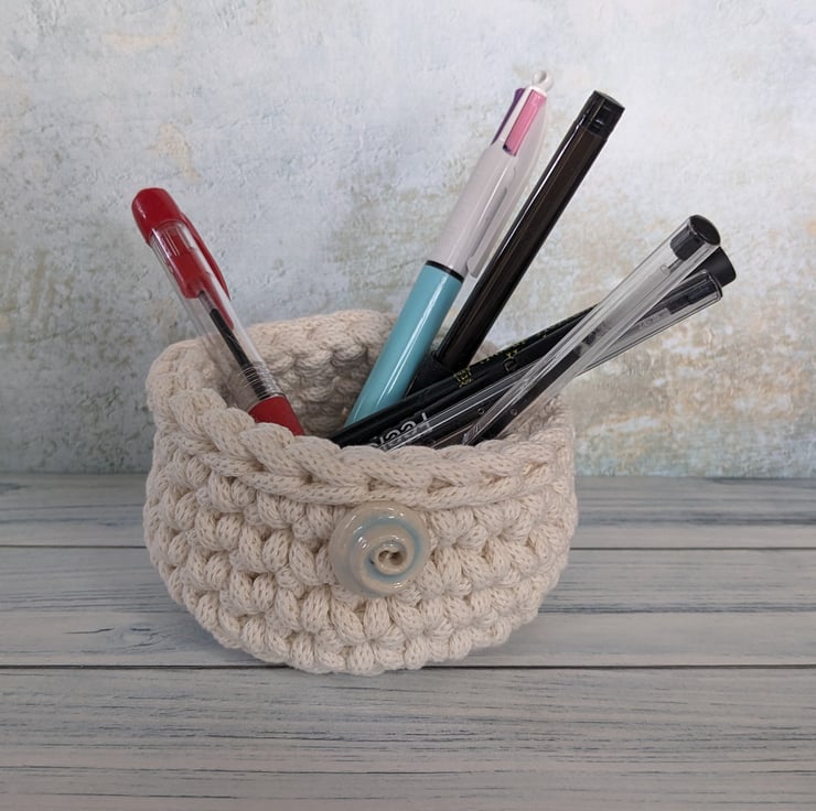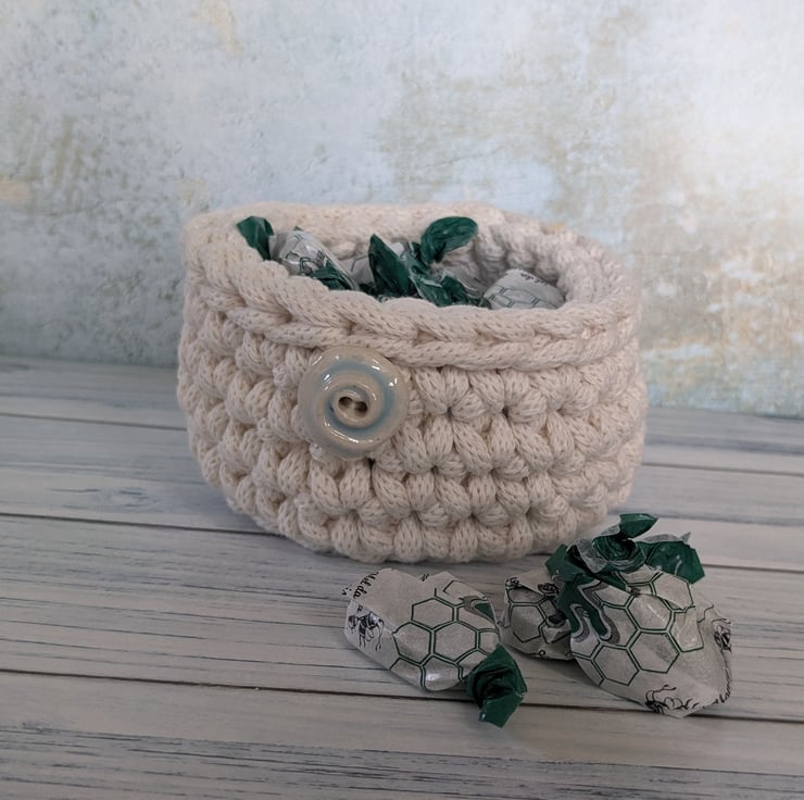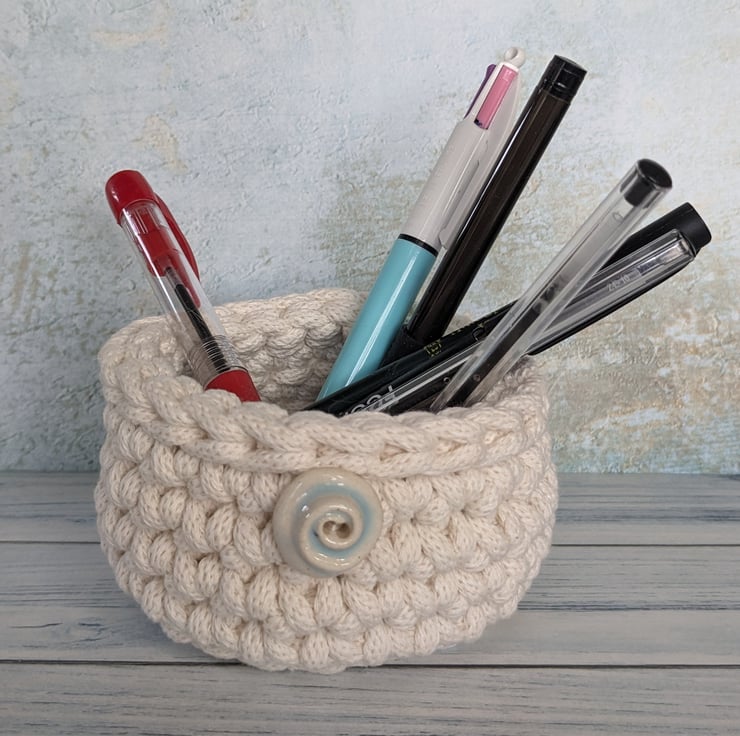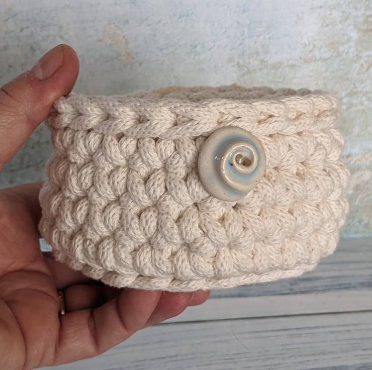 The container is flexible yet keeps its shape and the cord gives great definition to the crochet stitches used to create it. It has a slip stitch crocheted top edge making it both sturdy and decorative. It also features a beautiful ceramic button in a swirly, spiral design with pale blue highlights, that I have hand stitched onto the side as a special finishing touch.