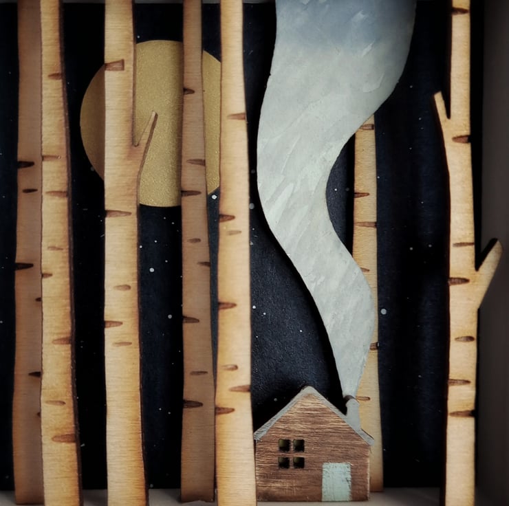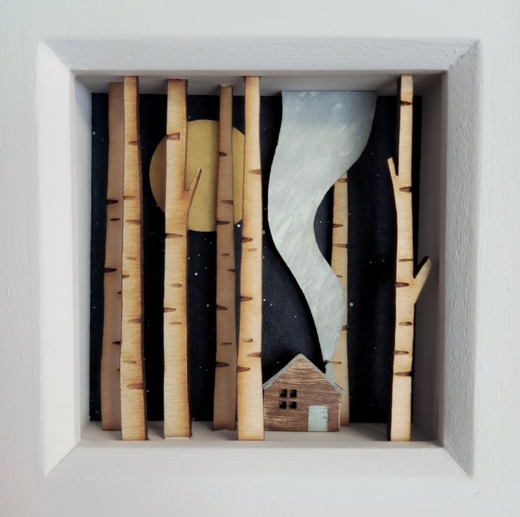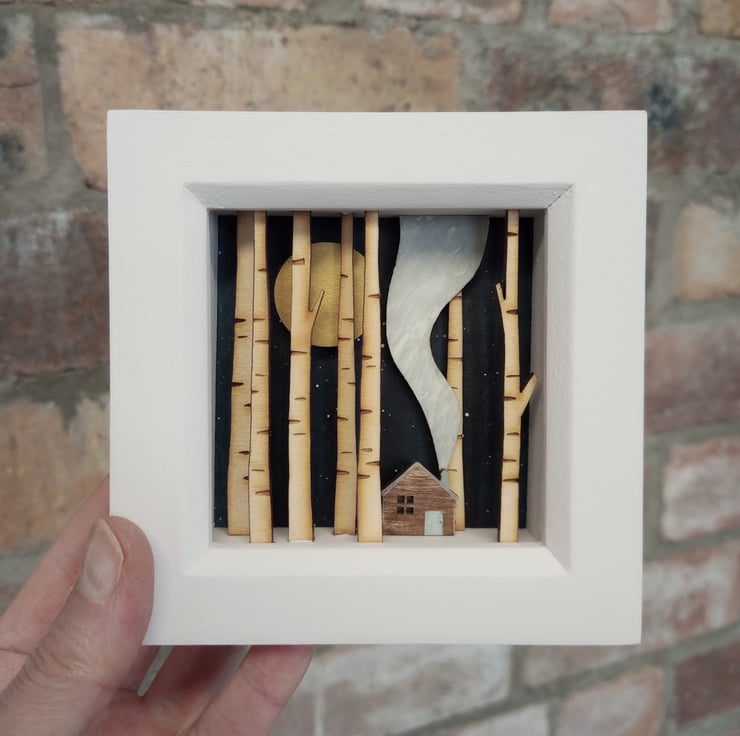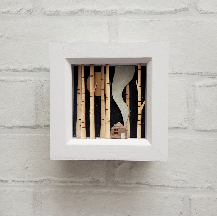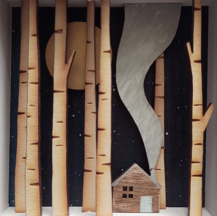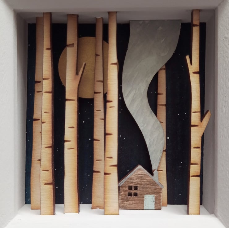 The design comes from original drawings which have been transformed into layers of laser cut wood, which I paint by hand, build up to form 3d layers and set into a glazed, pale grey wooden box frame, which measures approx. 11.5cm; the scene itself measures approx 7.8cm x 7.8cm x 1.5cm.