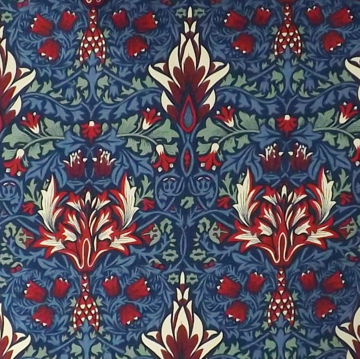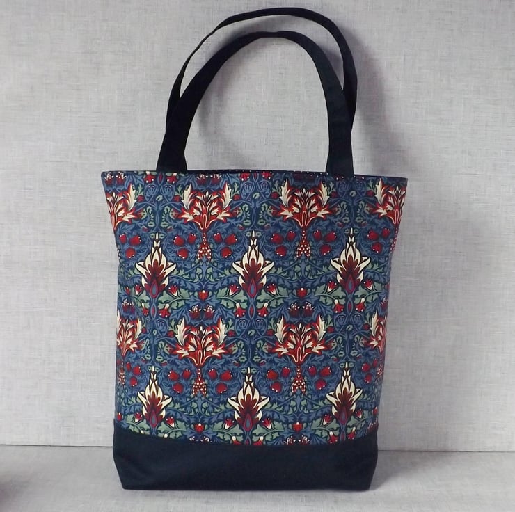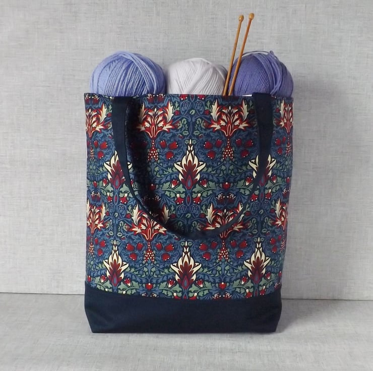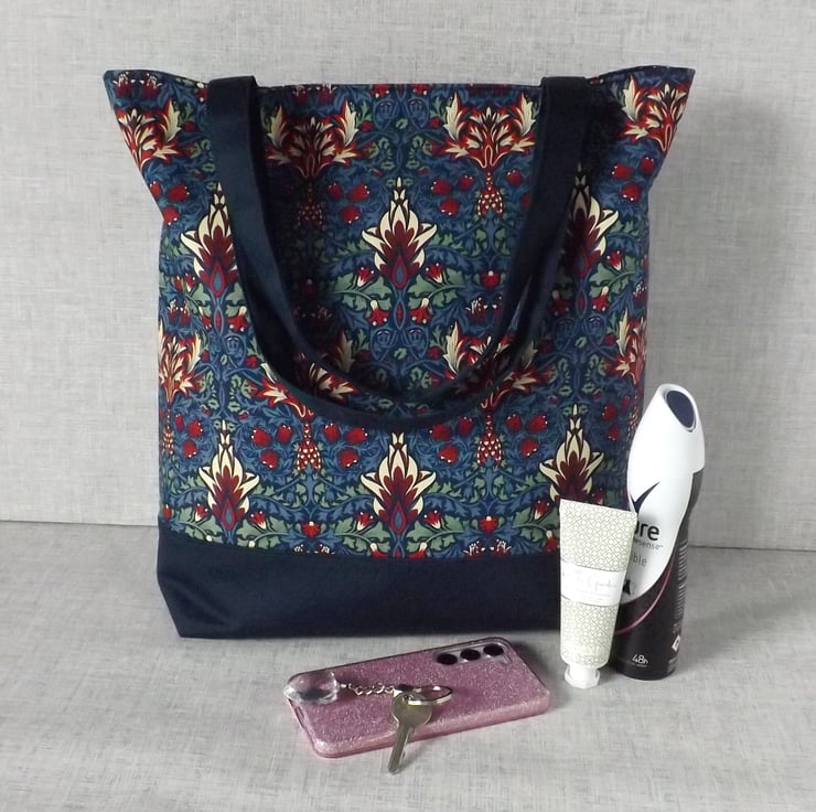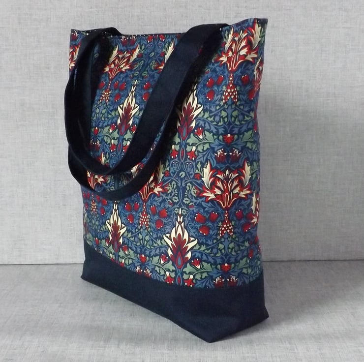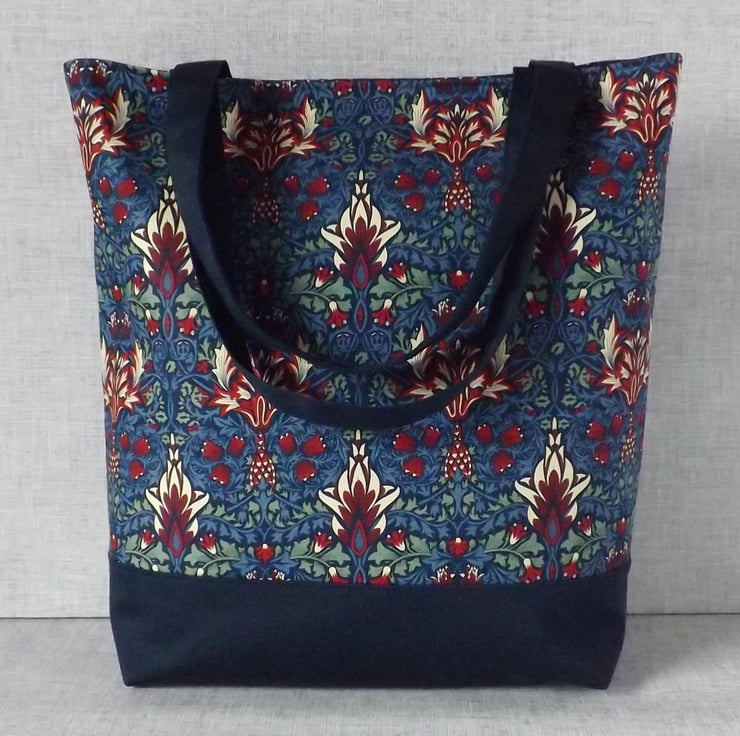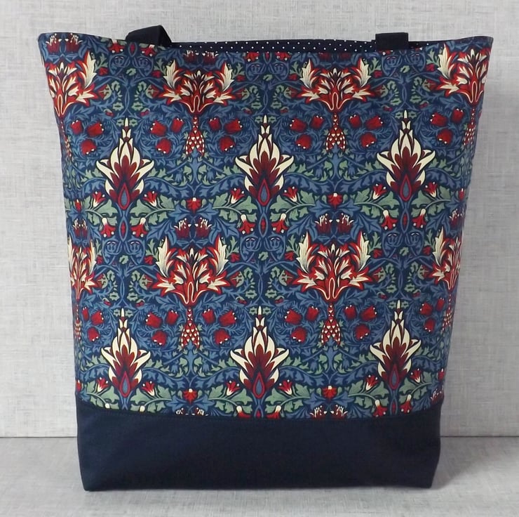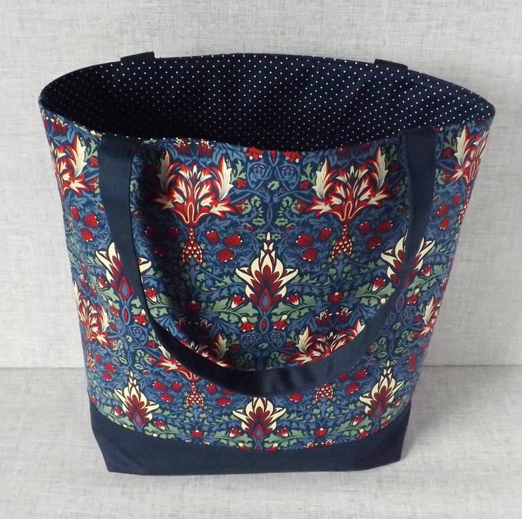 The main fabric is a lovely cotton from the William Morris 'Winter berries' range, in shades of blue, dark red, green & cream. This is combined with a plain navy blue cotton drill fabric. The lining is navy blue with small white spots.