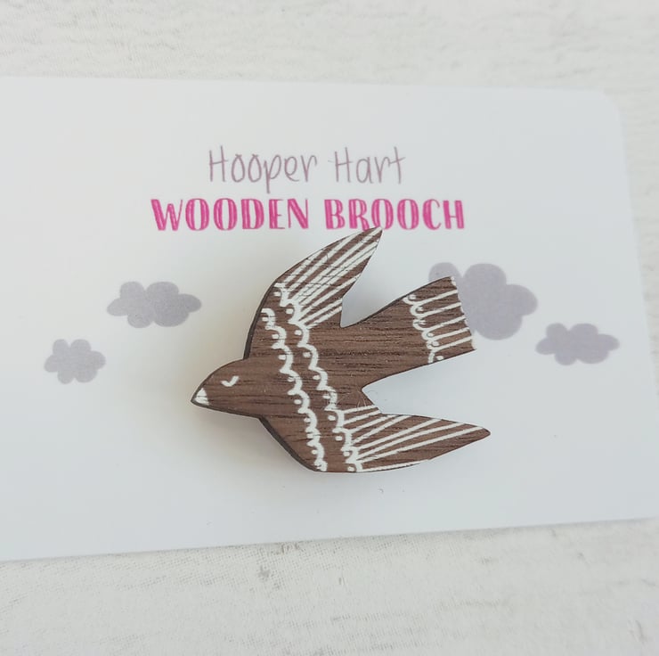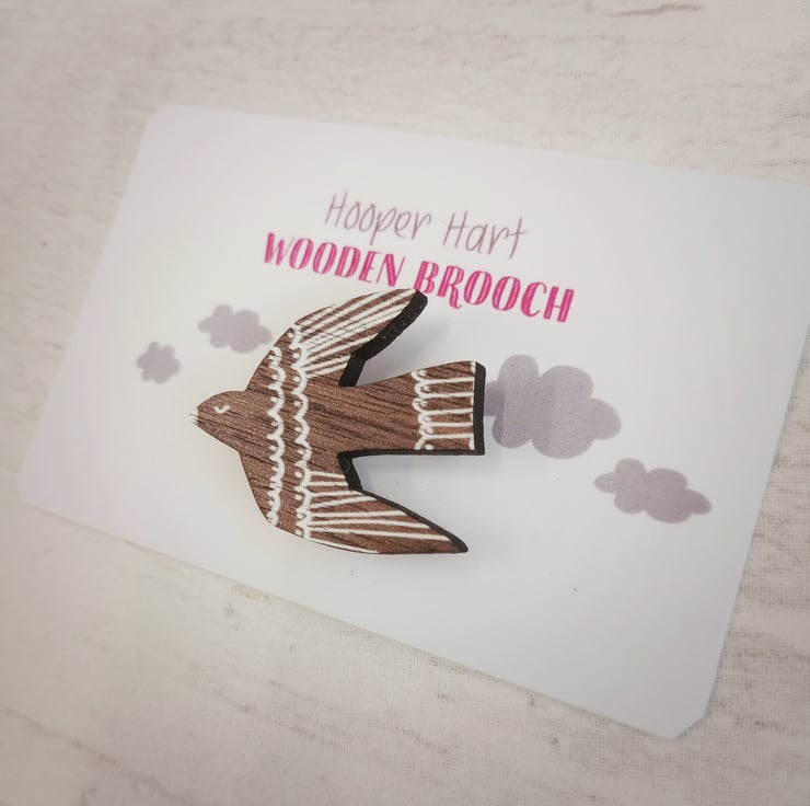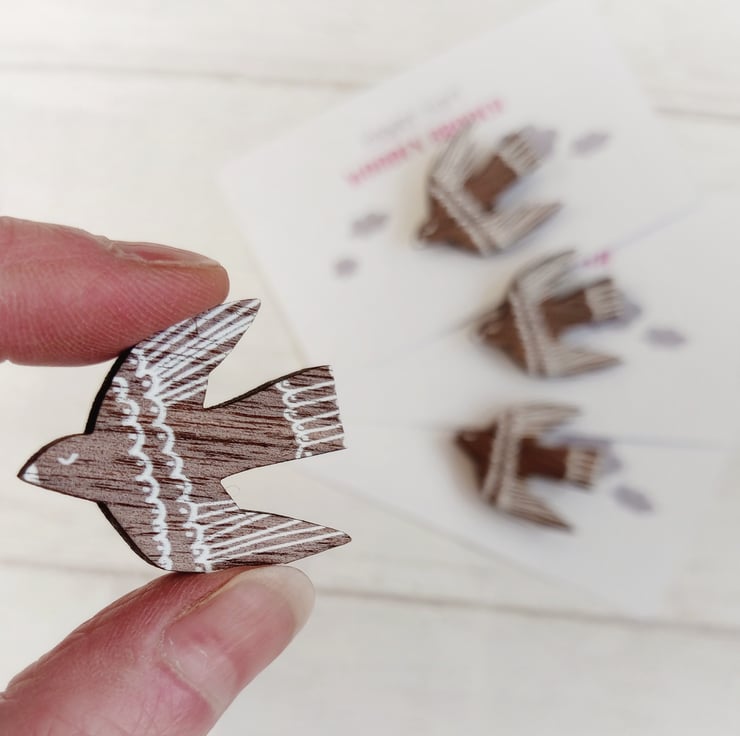 The bird is made from 4mm laser-cut veneered wood, with printed white details. It measures approx 3cm x 3.5cm, with a metal pin fastening on the back