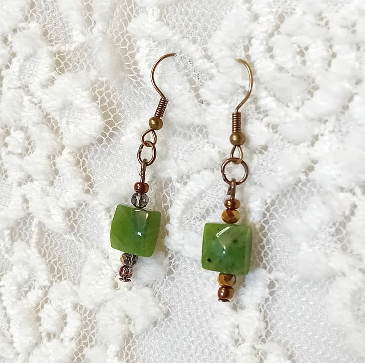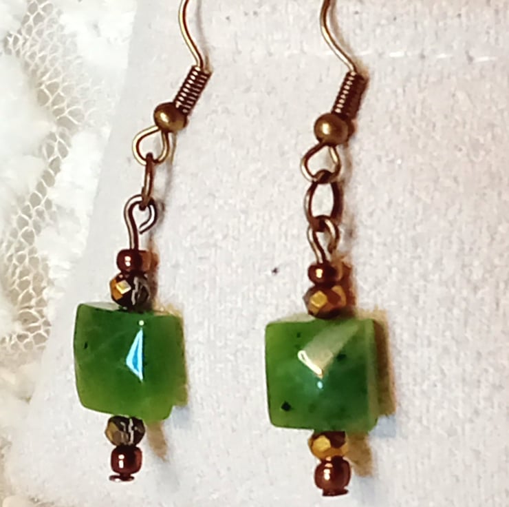 The gems measure 10 x 10mm and are beautifully complemented by gold Austrian crystals and bronze embellishments. Known as a stone of true abundance, it encourages the flow of wealth, fertility, and prosperity into one's life. Historically, this stone has been prized for its exceptional resistance to chipping, making it a popular choice for tools, art, and jewelry.