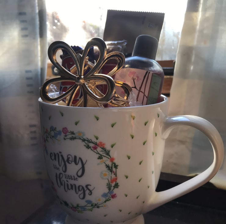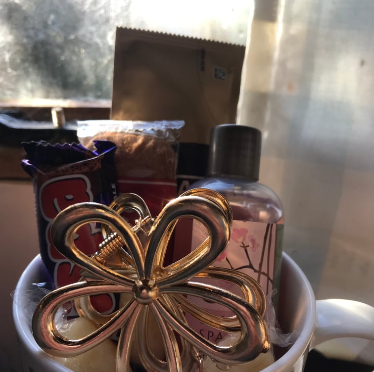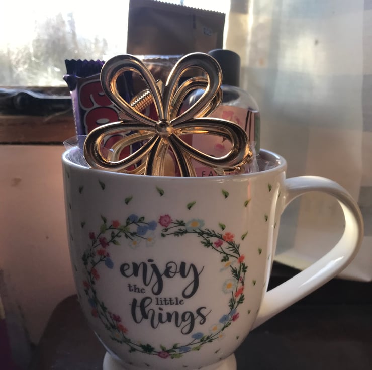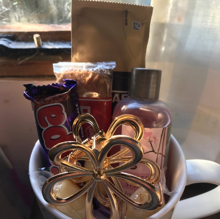 This mug includes, Nescafé coffee sachet, biscoff biscuits, wisps chocolate bar, some lovely lotion and a pretty metal flower hair grip.