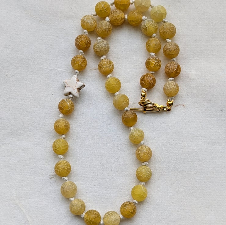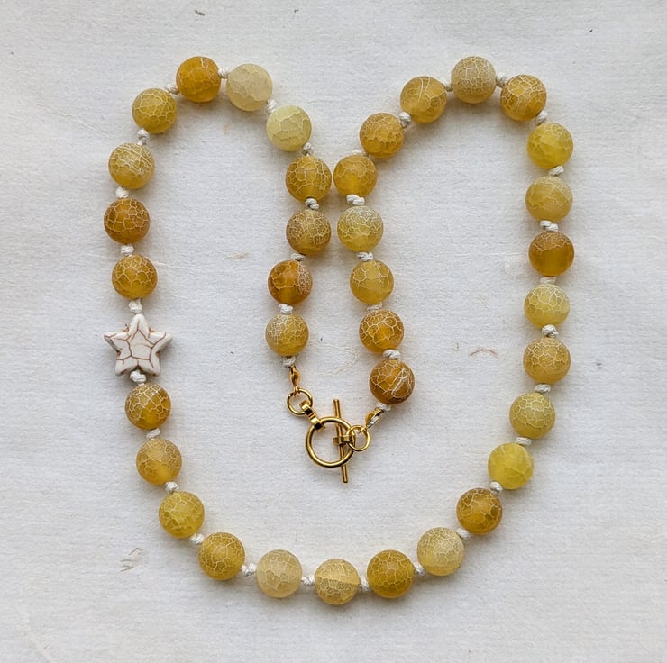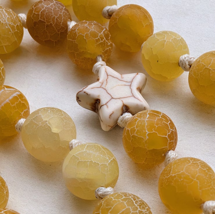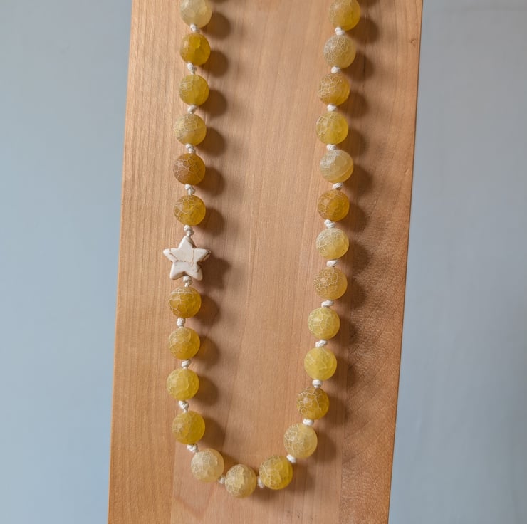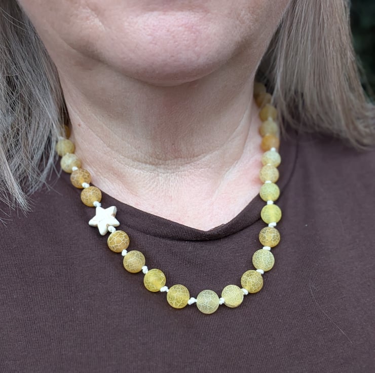 This handmade necklace features 10mm frosted matt yellow agate beads, individually knotted onto cream cotton cord for a soft, understated finish. A single cream howlite star sits slightly off-centre, adding a gentle decorative detail.