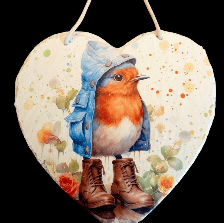 This large slate heart has been painted white and decoupaged with a beautiful Red Robin wearing oversized boots.