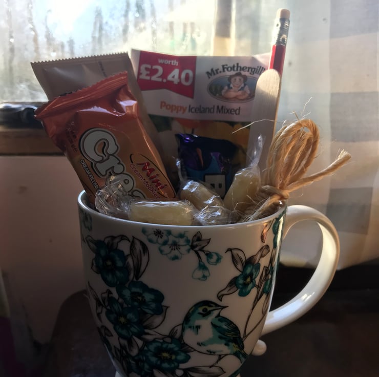 The gardening gift mug includes: Nescafé coffee sachet, orange cream biscuits, boost chocolate bar, seeds, wooden label and a pencil.
