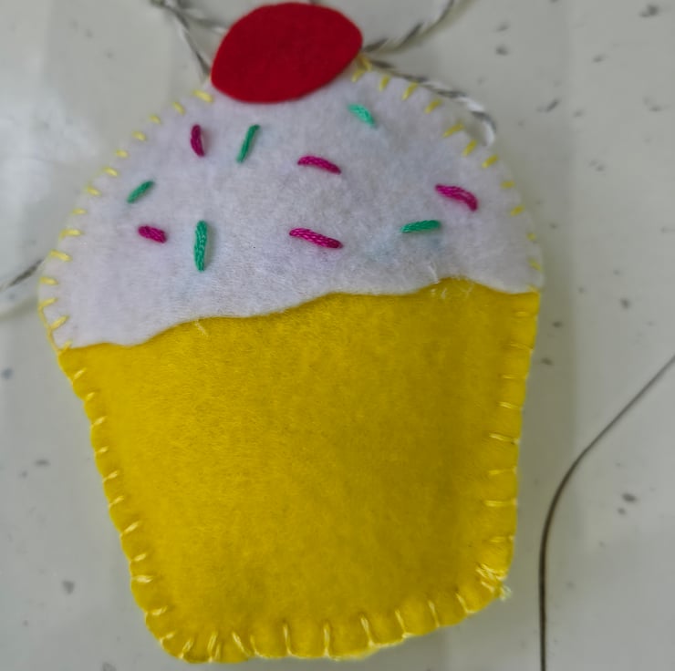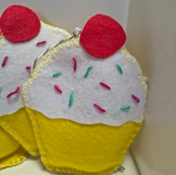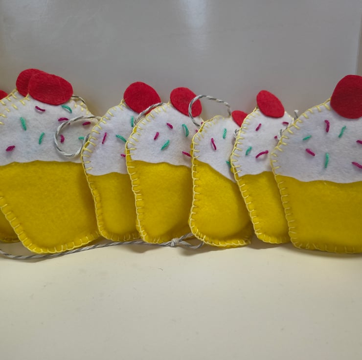 Bunting in a cupcake design, all hand stitched. Eight pieces 12cm in height, and approx 1.5 metres long.