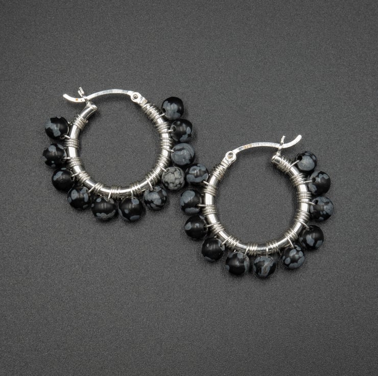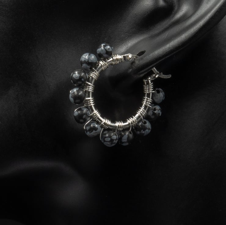 4mm smooth round snowflake obsidian beads are wrapped onto sterling silver hops with fine silver filled wire to create a lovely pair of neutral tone hoops. The sterling silver hoops have a secure latch closure.