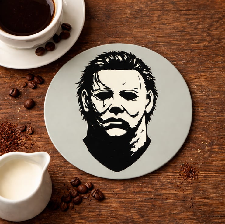 Add a spooky statement to your coffee table with this bold Michael Myers inspired coaster, perfect for horror fans and Halloween lovers. This design is made in a crisp black and white style and looks amazing in a modern home, gaming room, movie night setup or as a fun seasonal decoration.