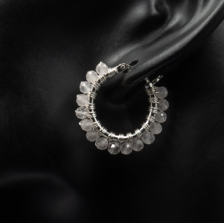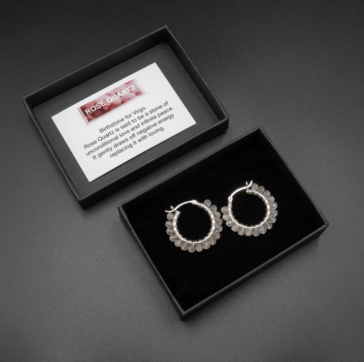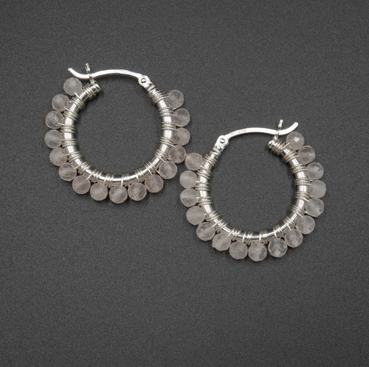 In these earrings small 3.5mm faceted pale pink rose quartz round beads have been bound with fine silver filled wire onto sterling silver hoops with a secure latch closure.