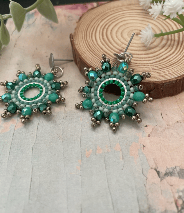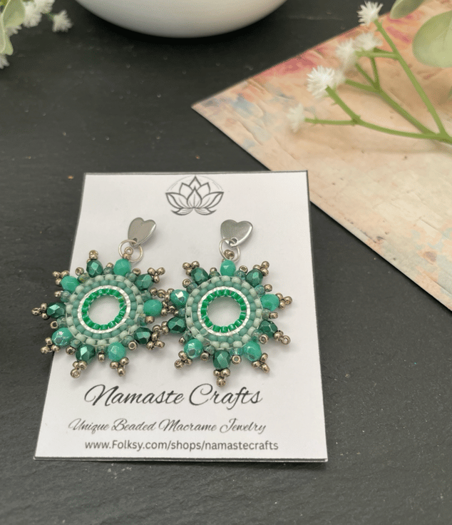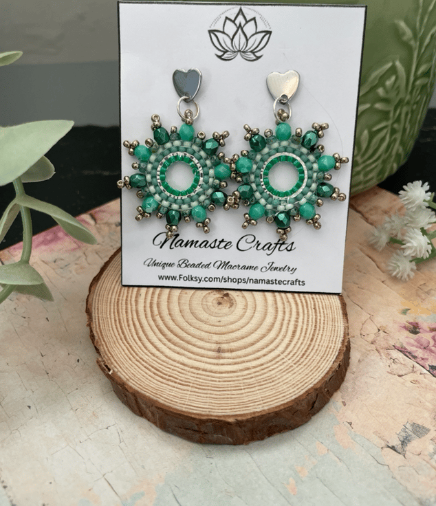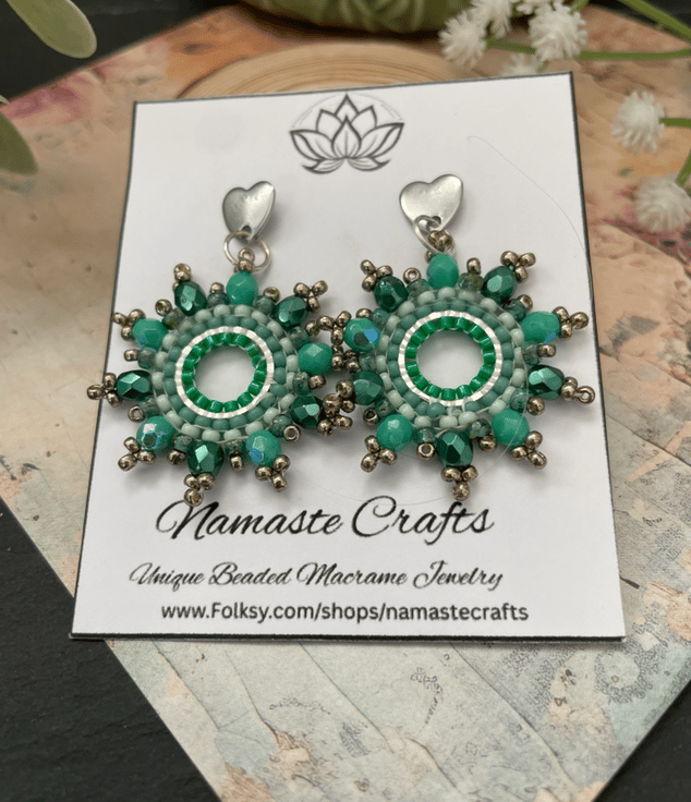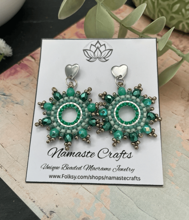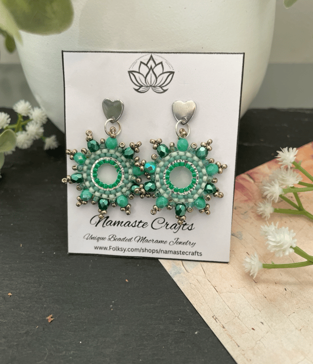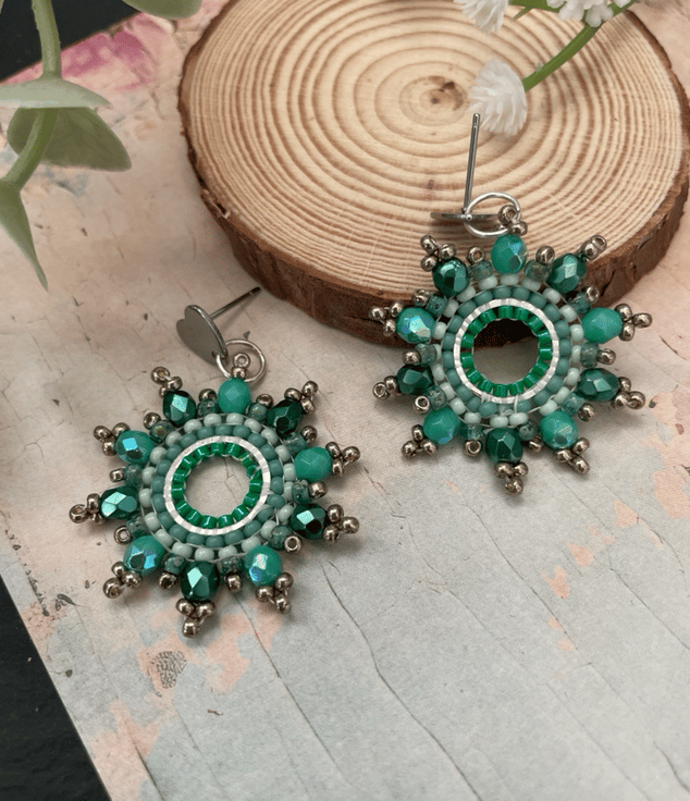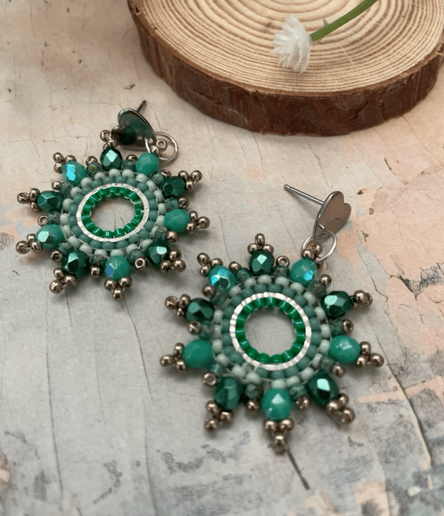 Designed and created in my Kent studio parallel rows of tiny glass Czech and fire polished glass seed beads have been hand woven to outline the silver hoop shape creating a beautiful pair of earrings that encompasses handcrafted, one-of-a-kind beauty ready to gift to that special person or to keep.
