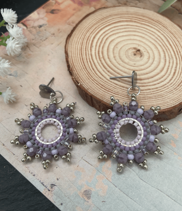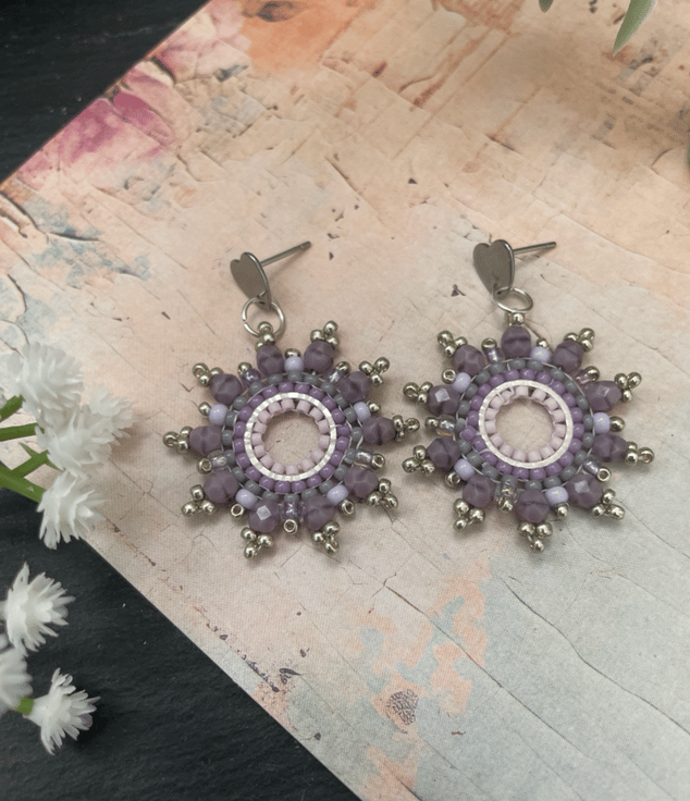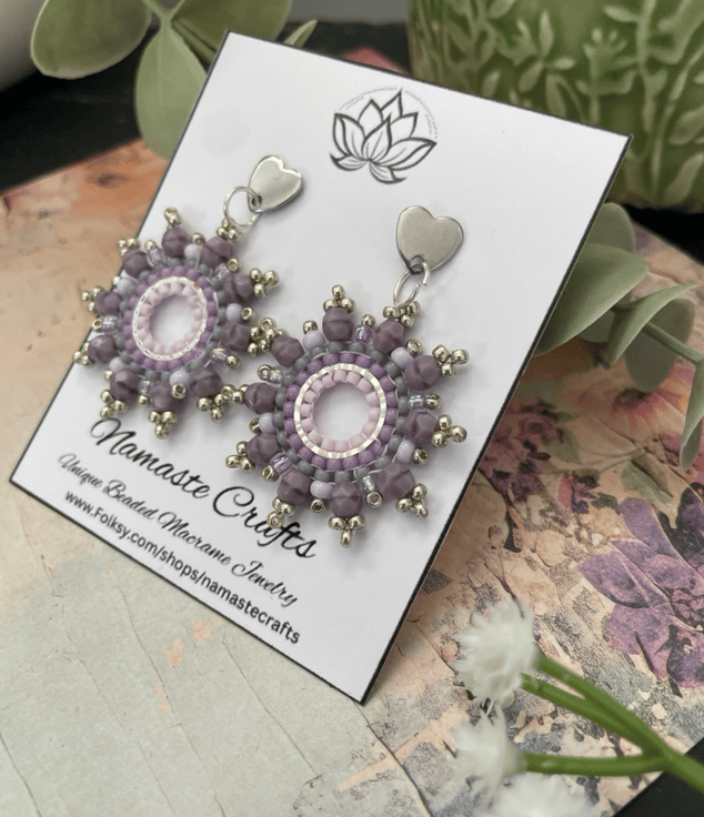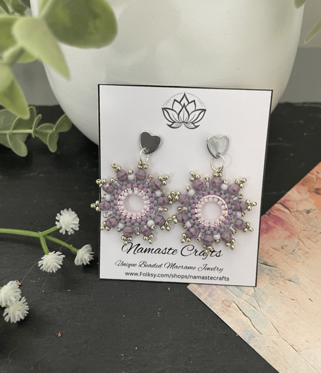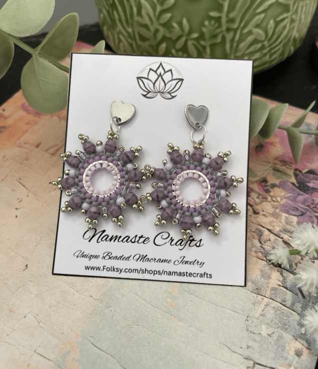 Designed and created in my Kent studio parallel rows of tiny glass Czech and fire polished glass seed beads have been hand woven to outline the silver hoop shape creating a beautiful pair of earrings that encompasses handcrafted, one-of-a-kind beauty ready to gift to that special person or to keep.