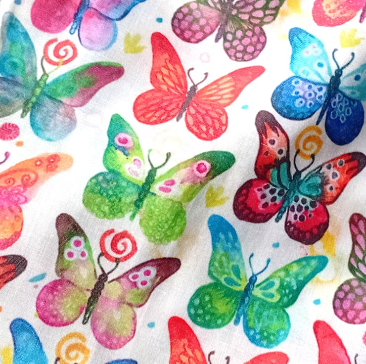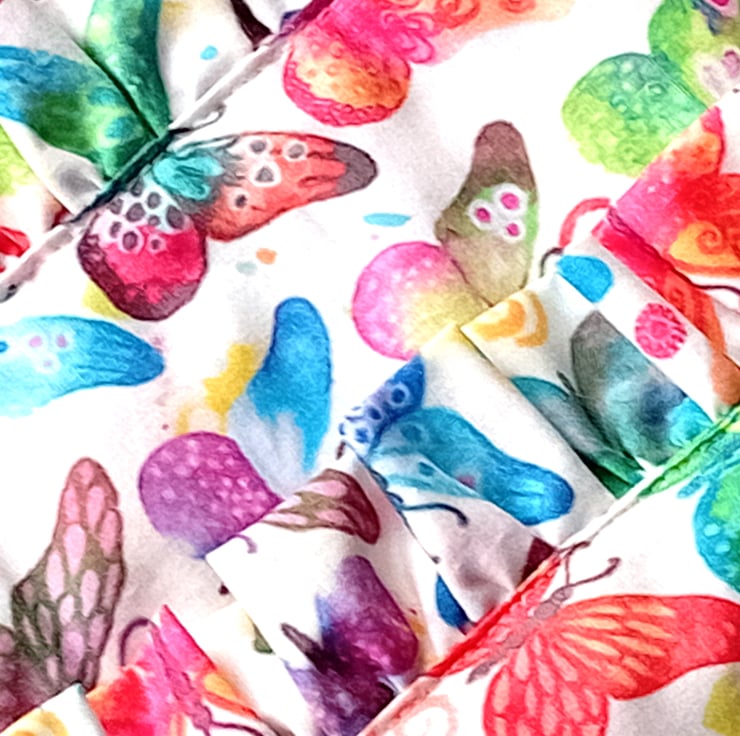 BUTTERFLIES in multicolours on IVORY background outer fabric. Inner fabric of small multicoloured butterflies on a white background.