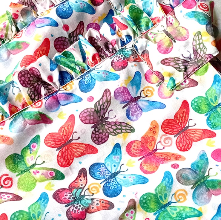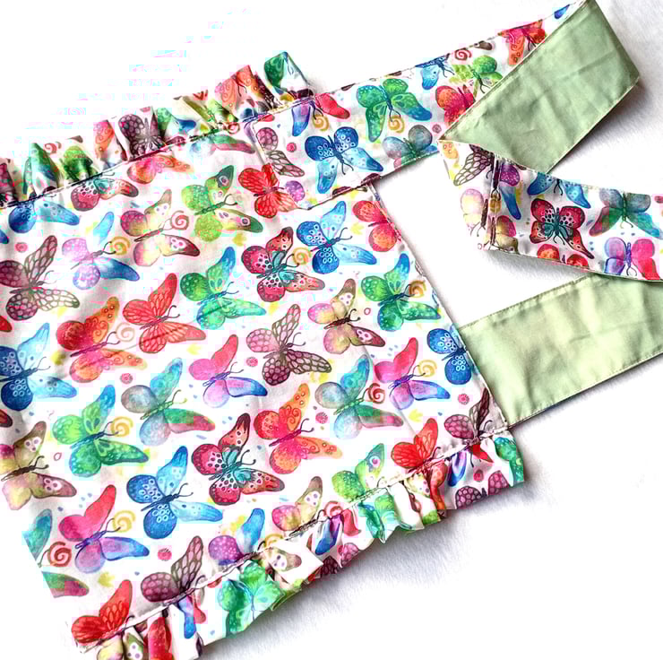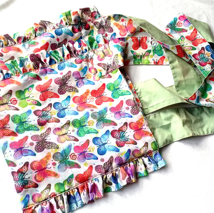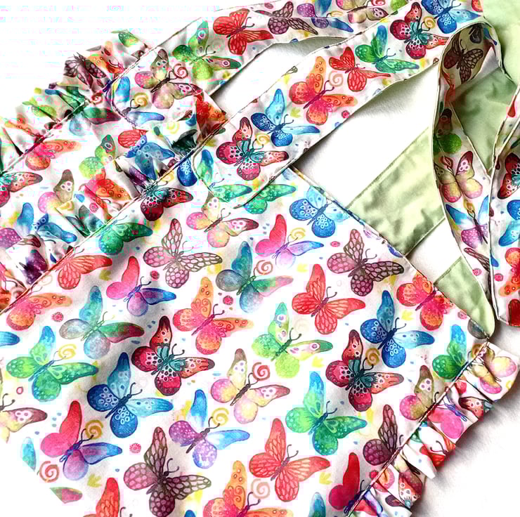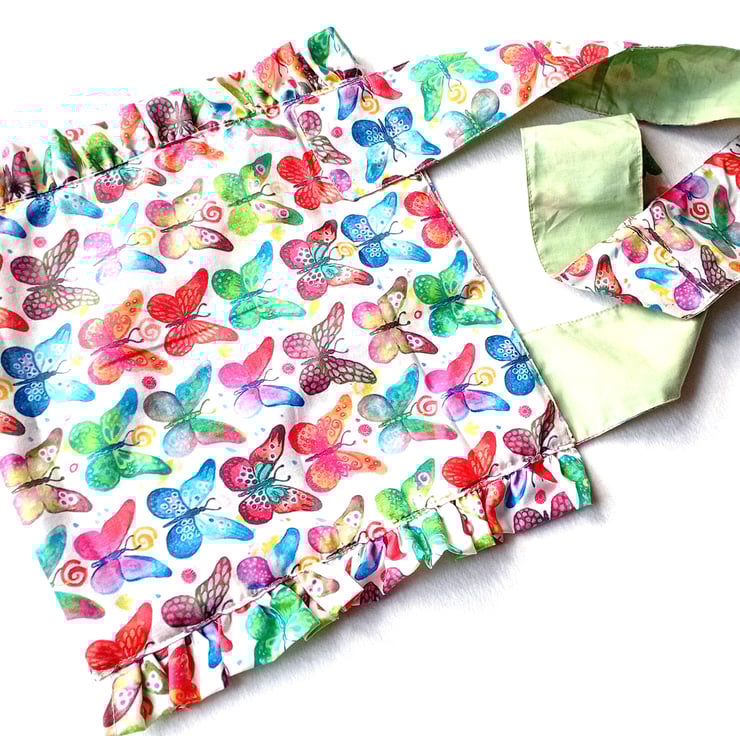 Linear design with wide shoulder carrying strap for carrying over shoulder, can be reversible to show complementary butterflies themed interior fabric. Ruffles only visible on with outer fabric.