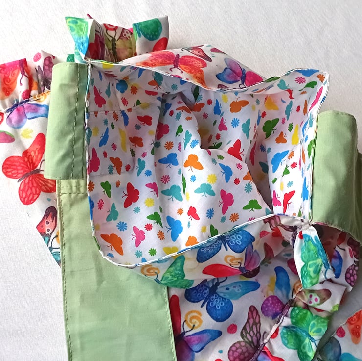 MEDIUM Tote style ruffled sides, shoulder bag with novelty, theme colourful BUTTERFLIES fabric design to be used as everyday small shoulder bags, ideal as holiday, extra travel bag, easy to fold and pack. Informal, lightweight, casual, spring/summer accessory.