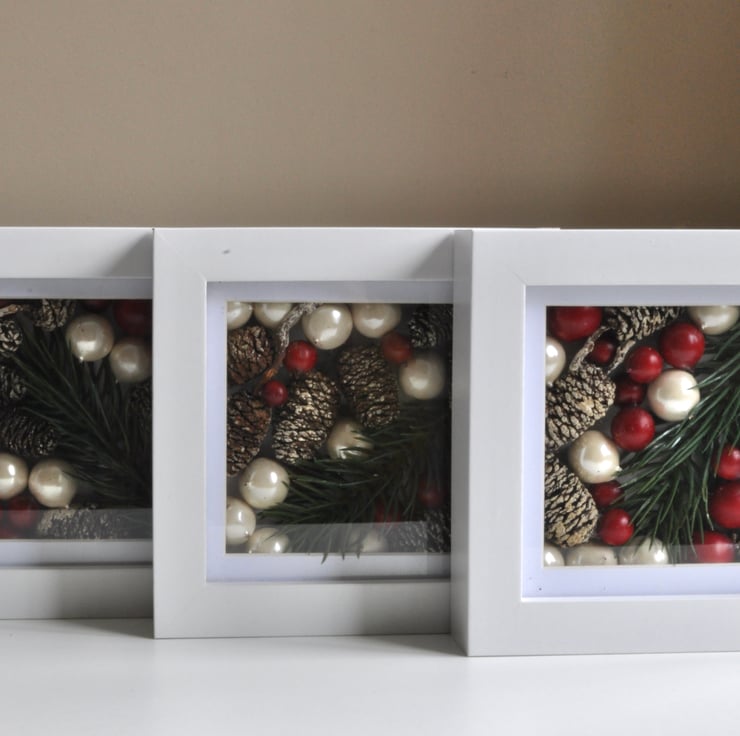Set of 3 box frame pictures, each 12cm x 12cm, displaying artificial berries, pine branches and pine cones, Hanging loops on back or will free stand on a shelf nestled amongst Christmas decorations.