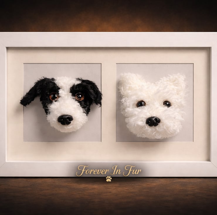 Celebrate the special bond between two beloved pets with a completely bespoke double 3D dog portrait, lovingly handcrafted to capture their unique personalities, markings, and expressions.