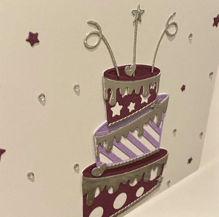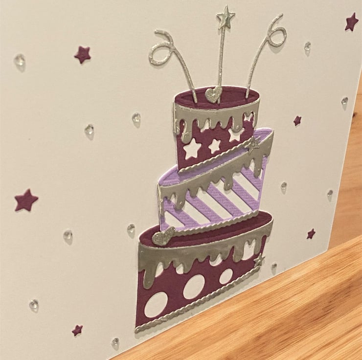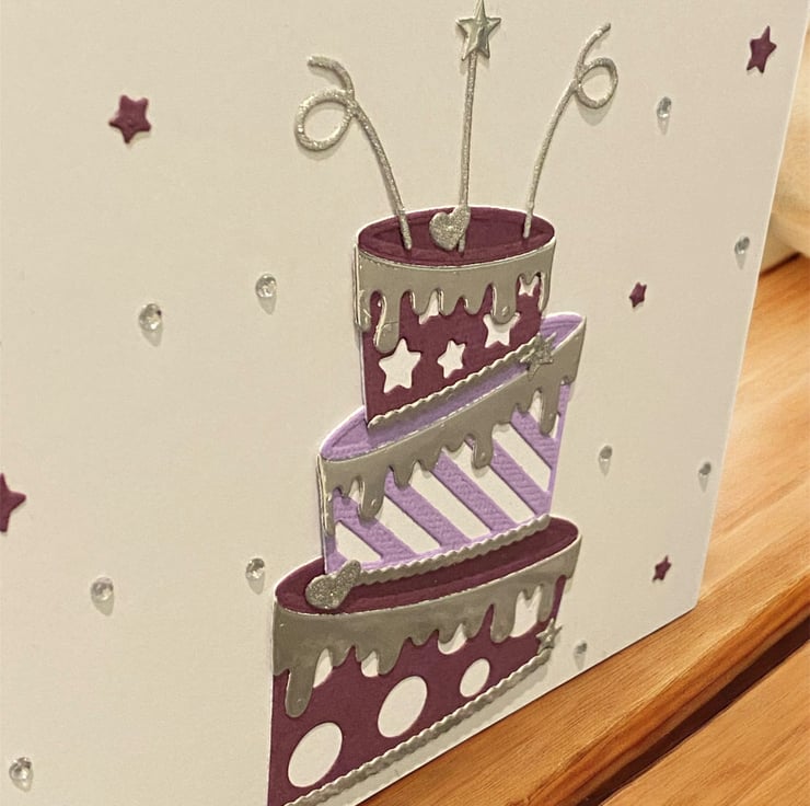 Celebrate in style with this elegant handmade birthday card, featuring a whimsical three-tiered cake adorned in rich purples and shimmering silver. Each layer showcases a unique pattern—stars, stripes, and polka dots—topped with sparkling embellishments that evoke festive candles or celebratory sparklers.