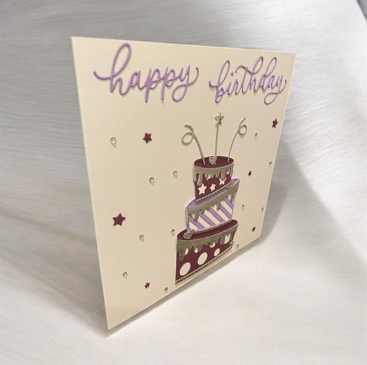 Set against a clean white background, the cake is framed by scattered star and gem-like decorations, adding a touch of magic. The words happy birthday is die cut in a flowing cursive font, bringing a joyful and personal feel to the design.