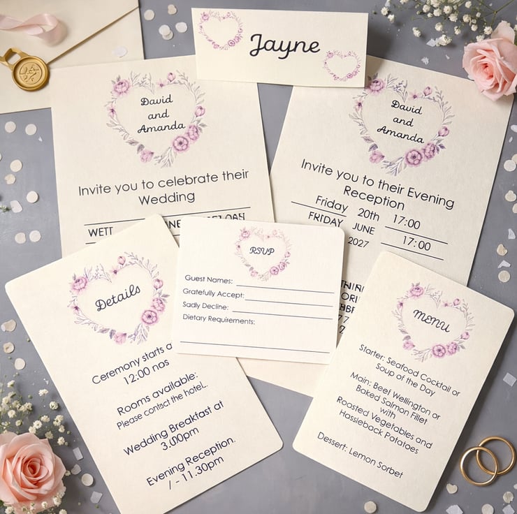 Invite your guests to celebrate with you after the ceremony with this personalised evening wedding invitation, featuring a soft purple floral heart design and a clean modern layout. Perfect for couples who want their evening stationery to match their main wedding invitations while keeping the style elegant, romantic and easy to read.