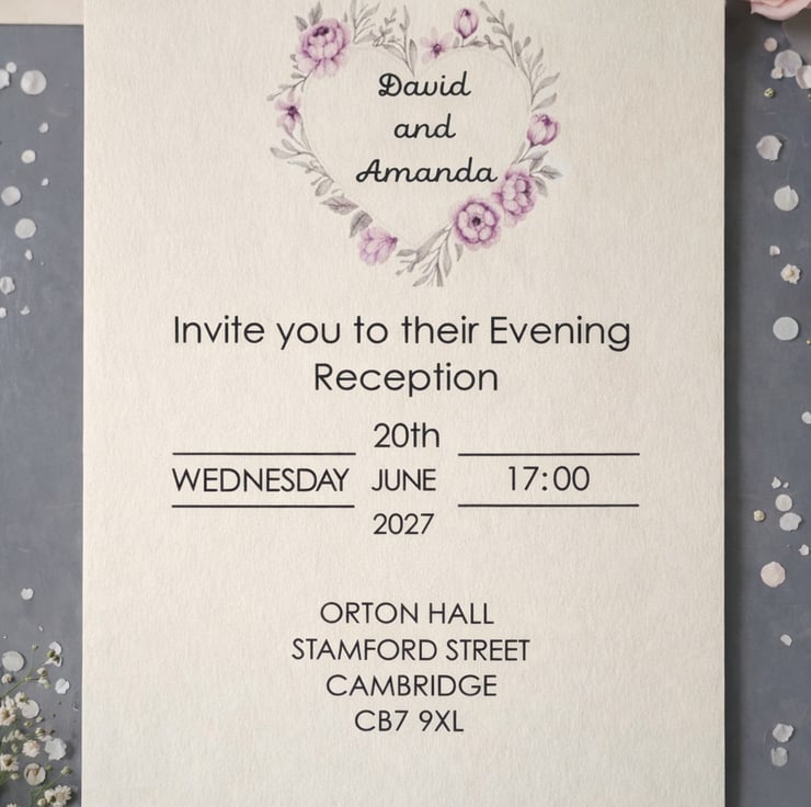 Each evening invitation is professionally printed and personalised with your names, reception details, date, time and venue. The simple typography and floral heart border make this a timeless choice for spring and summer weddings, rustic venues, or classic celebrations with a lilac and botanical colour theme.