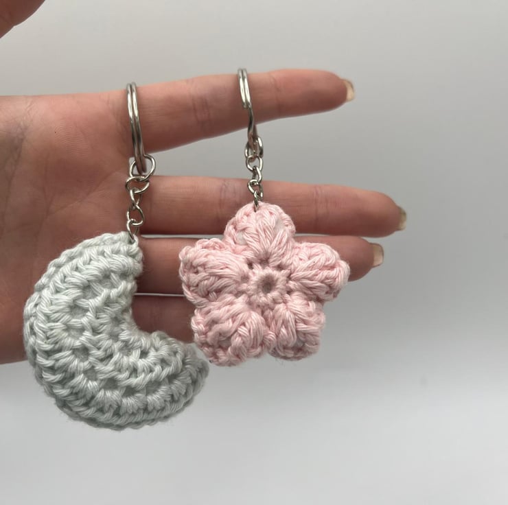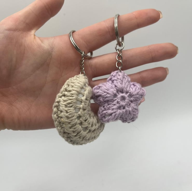 Handmade crocheted moon and star keychains in available colours; moon- white & star- yellow, moon-blue & star- pink, moon- grey & star- purple.