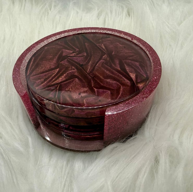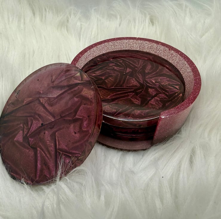 This beautiful set of four plum & gold resin coasters have a striking “velvet” appearance despite being completely smooth. Suitable for hot and cold drinks, the coasters come with a matching holder for easy storage.