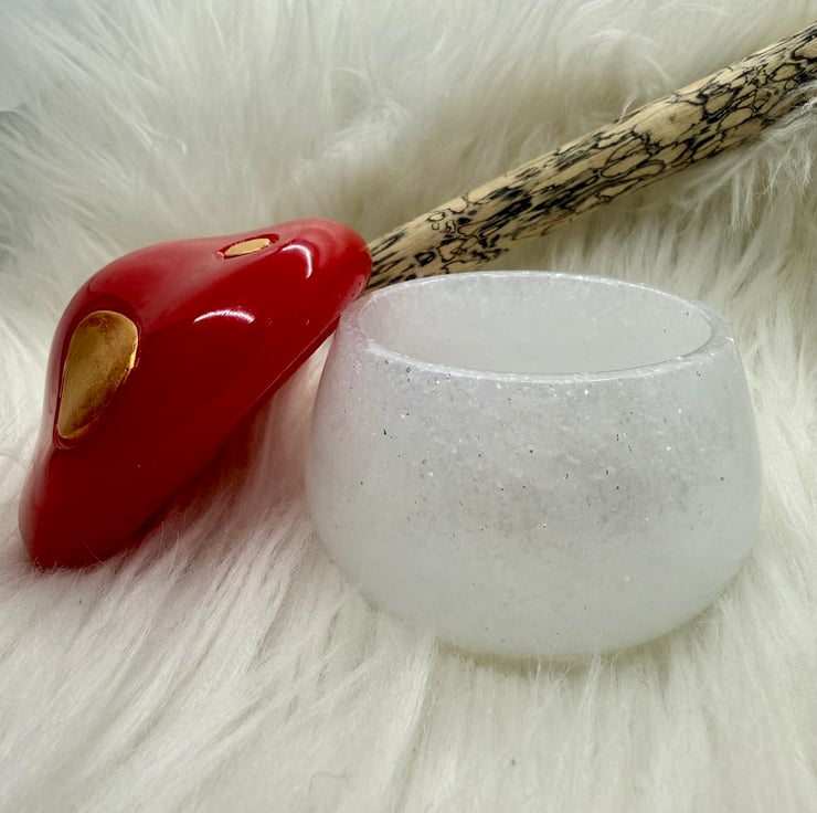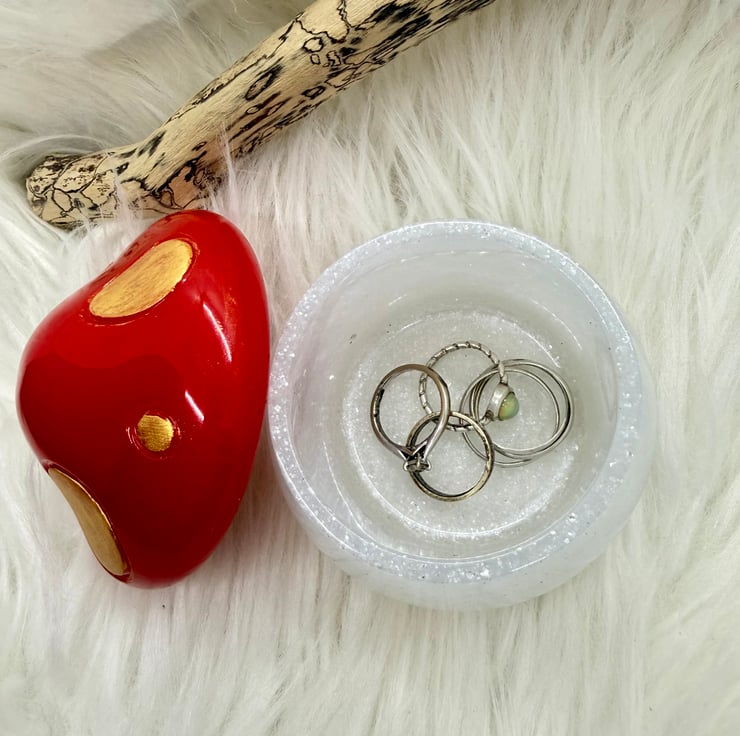 This adorable, chunky little mushroom trinket or jewellery box is made from resin, with hand painted golden spots on a bright red lid and a glittery white pot.