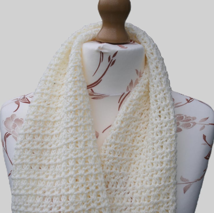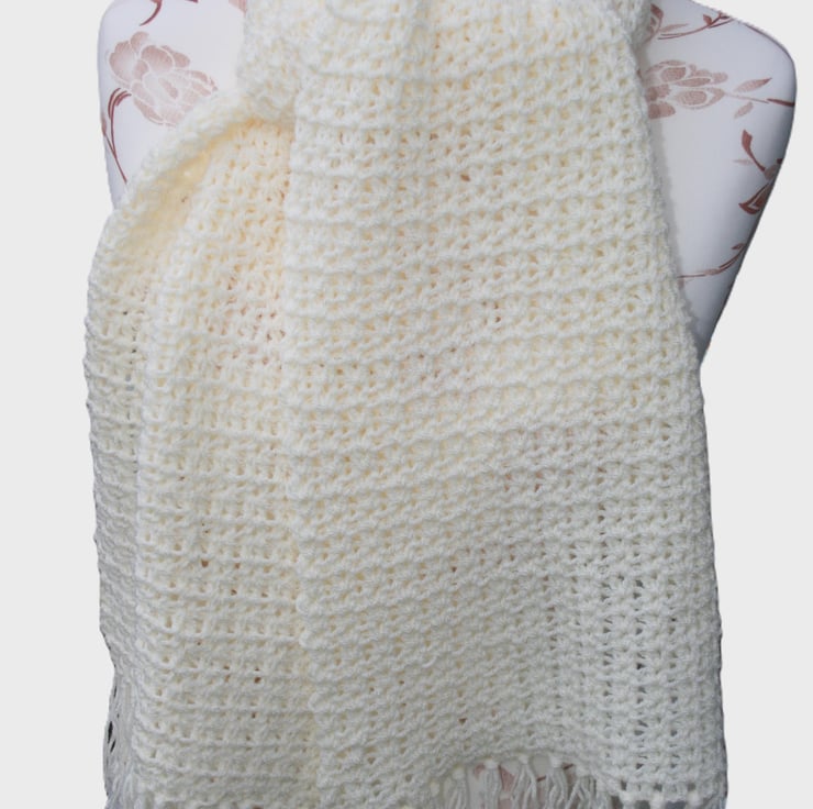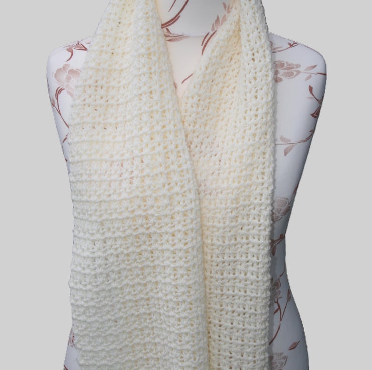 This is a very lovely cream crocheted scarf that is very soft and a versatile addition to your winter wardrobe. Ideal with different coats and outfits. It can be worn everyday or for a particular evening out. Made with kind permission of the original pattern designer. Whist I have made every effort to capture the true cream shade of the scarf it may appear slightly different on your screen. Computers vary screen to screen.