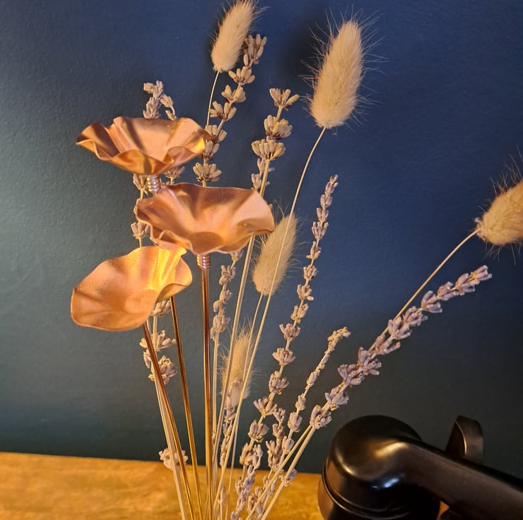These vibrant copper poppies are handcrafted from solid copper. They can be used inside or outdoors but please keep in mind copper undergoes a natural process called oxidation, which results in the formation of a blue-green patina on its surface when left to the outdoor elements. If used indoors they will stay shiny.