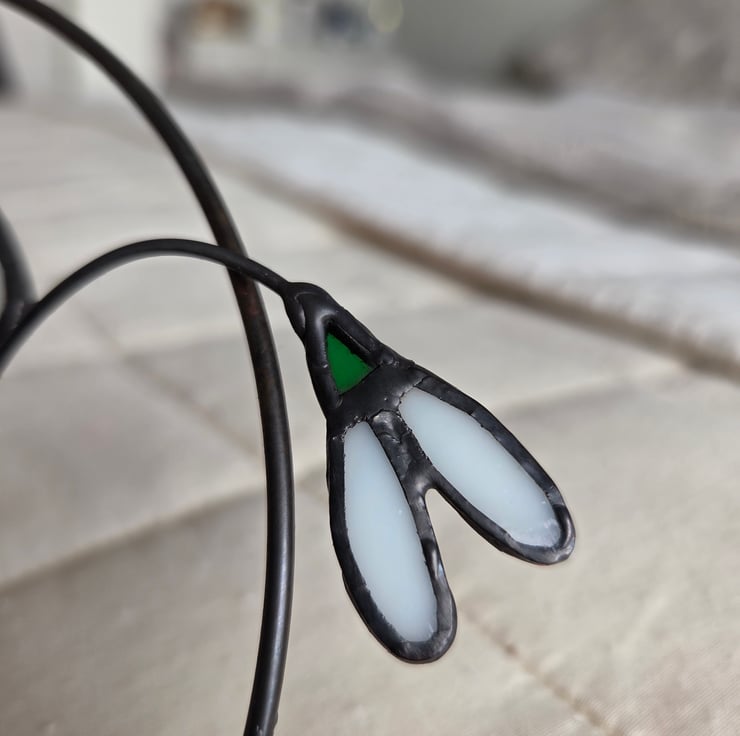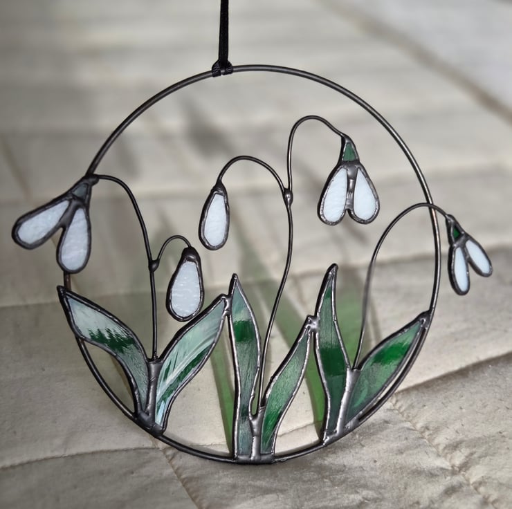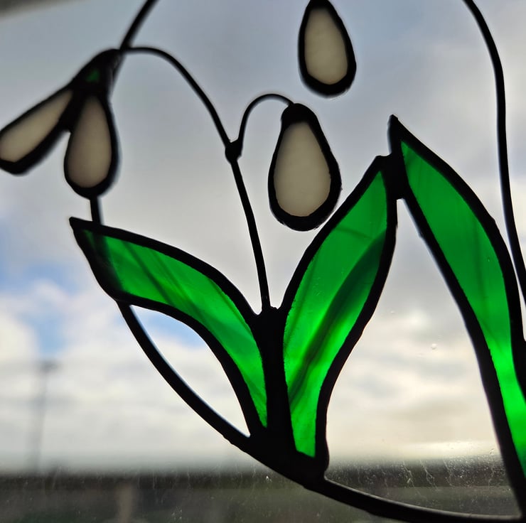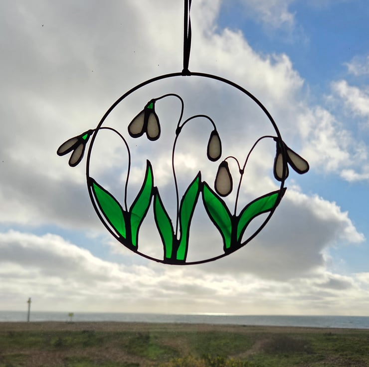 This hand crafted stained glass hanging is inspired by the first glimpse of Spring, the exciting moment when you first spot a Snowdrop!