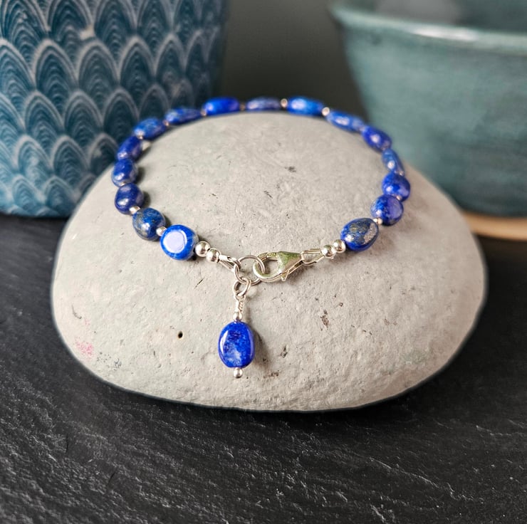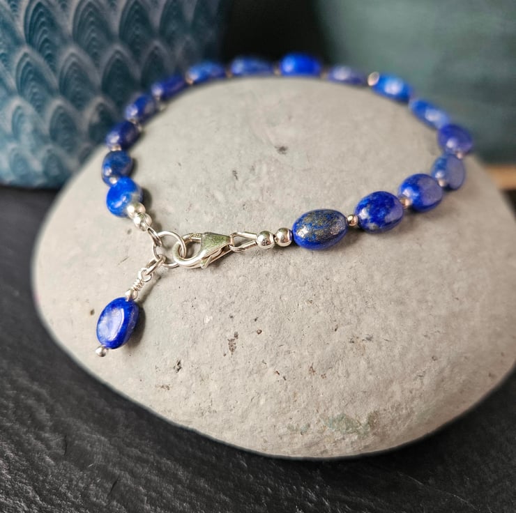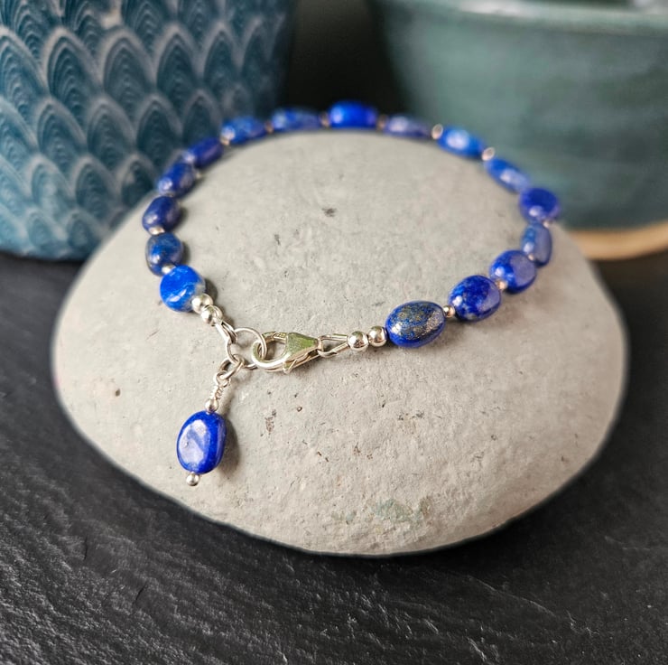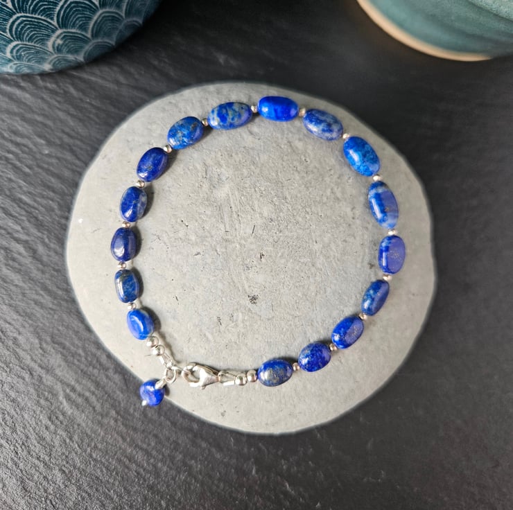 This gemstone bracelet features oval-shaped, natural lapis lazuli beads interspaced with small, round, sterling silver beads. The bracelet fastens with a sterling silver carabiner clasp and measures just inder 21cm in length with an inner circumference of 19cm. All the metal elements of the bracelet are sterling silver.