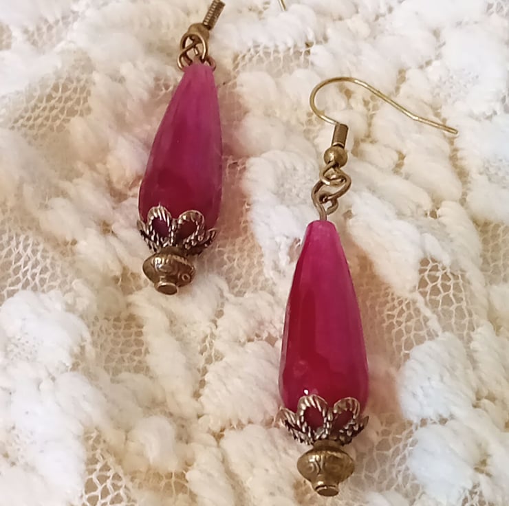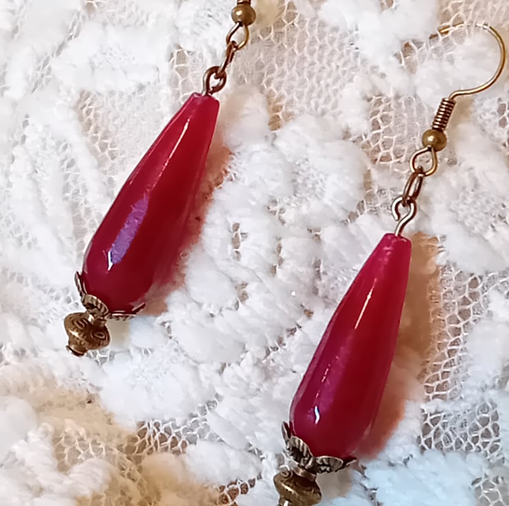 These stunning Garnet waterdrop earrings are expertly faceted to enhance their natural brilliance. Measuring 3 cm in length and 1 cm in width, they feature elegant Bronze embellishments that add a timeless antique charm. Choose between Fish Hook or Lever Back closures at no additional cost.