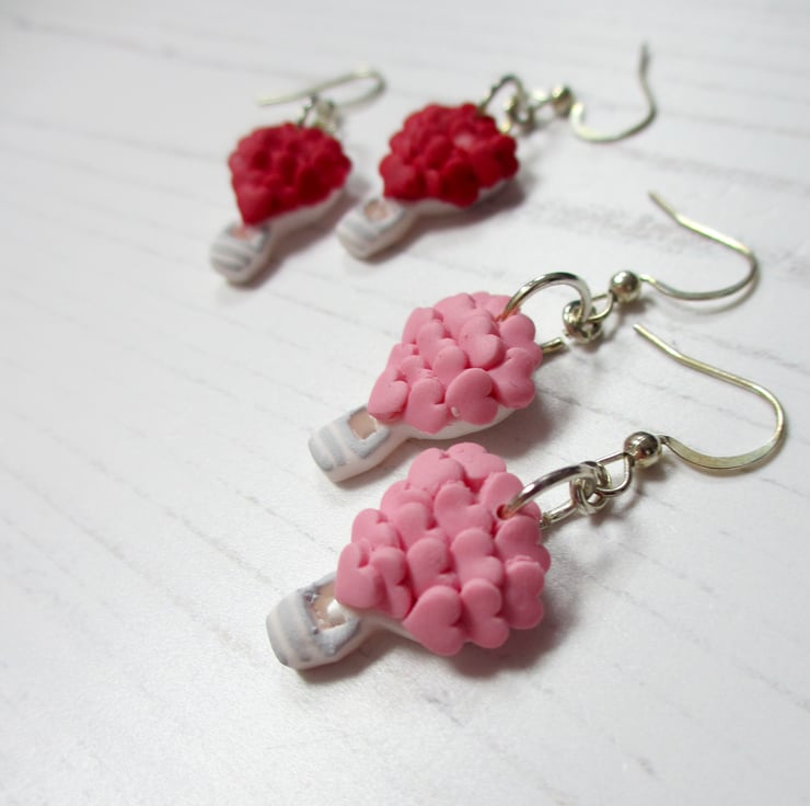 Beautiful for Valentine's or throughout the year, A pair of gorgeous and delicate hot air balloon earrings, being lifted by a huge bunch of heart mini balloons!