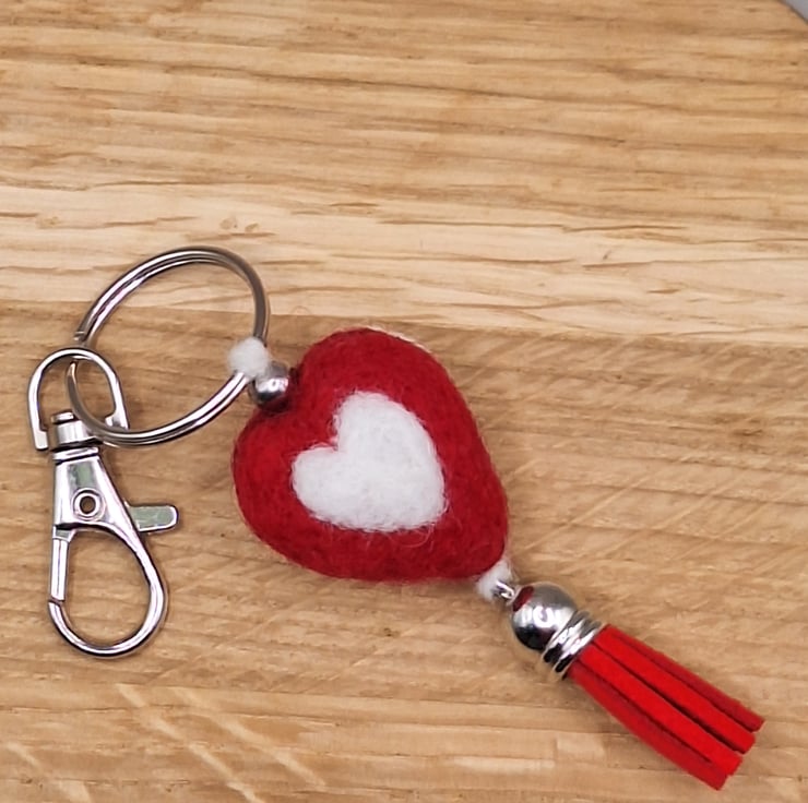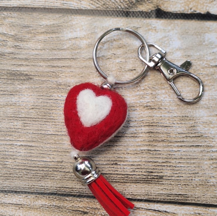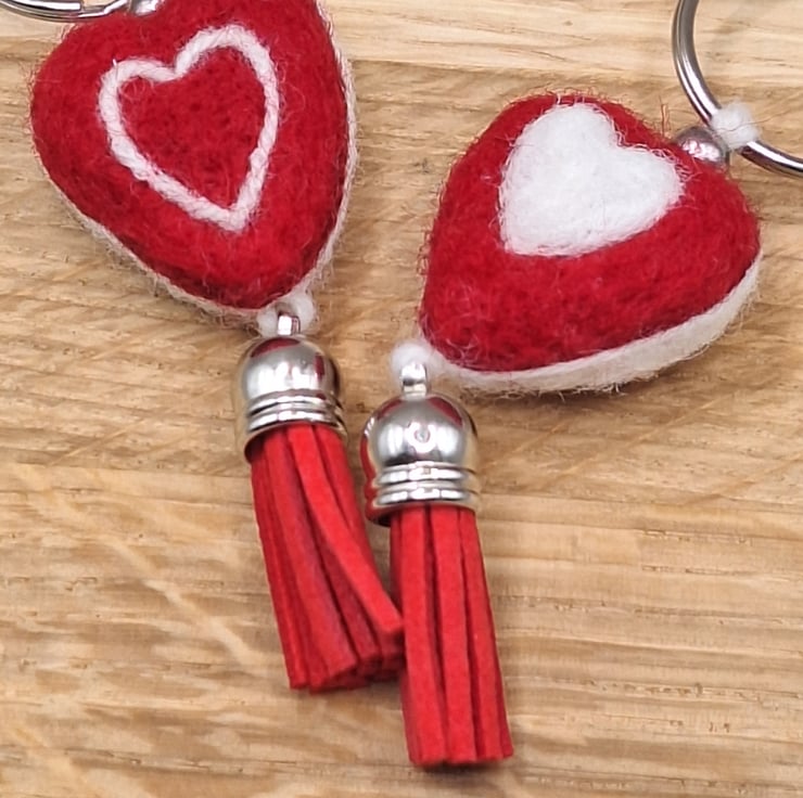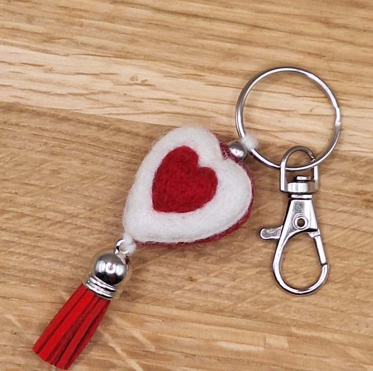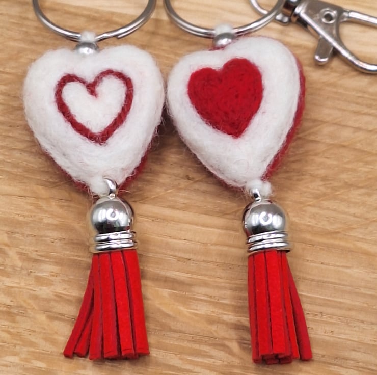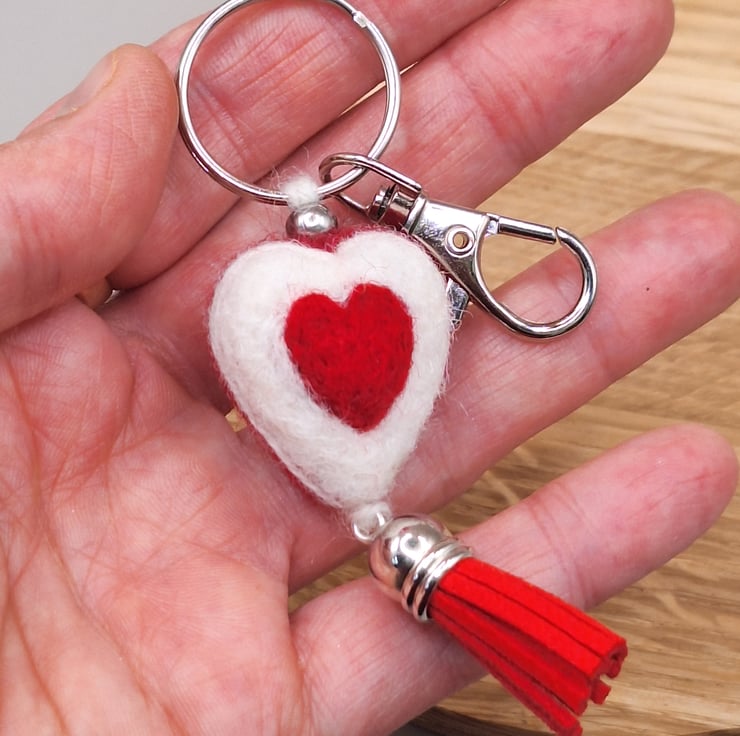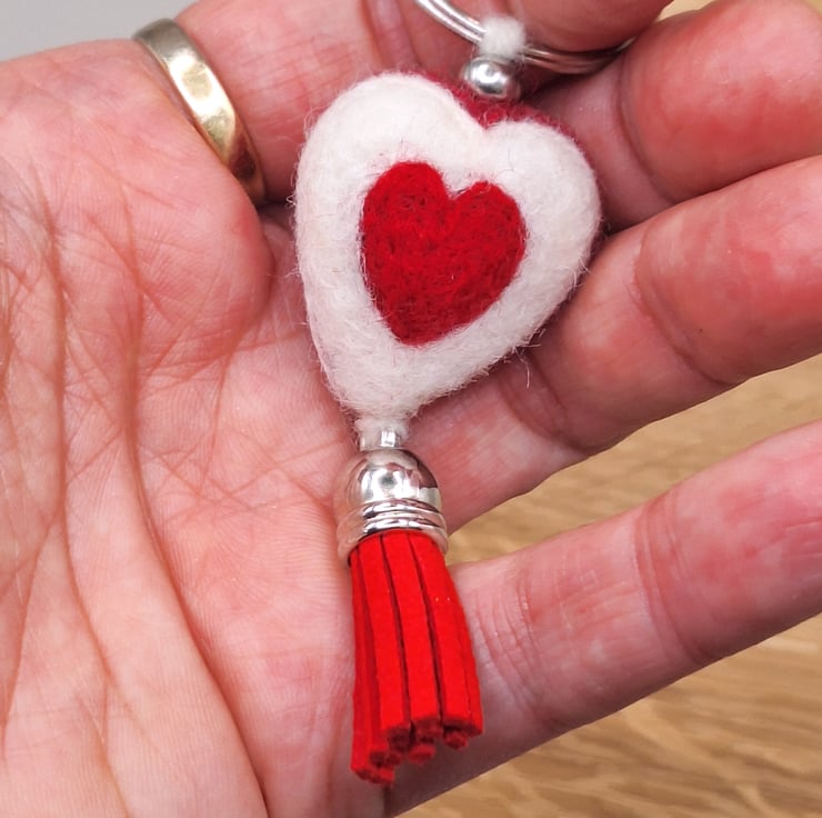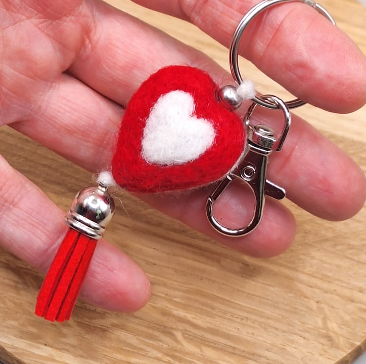 Needle Felted Heart Keychain – Reversible Red & White Heart Charm with Tassel