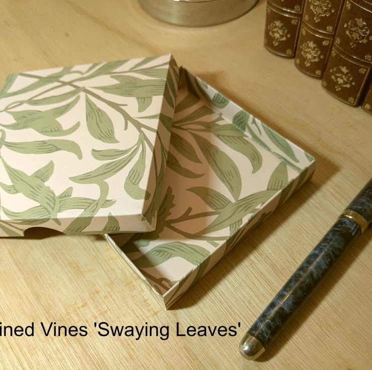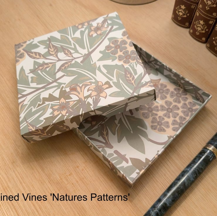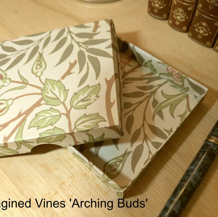 A set of four ultra-thin, handmade gift boxes with separate lids based on designs reperesenting imagined vines. This set features Thorn Flowers, Arching Buds, Swaying Leaves, and Natures Pattern designs.
