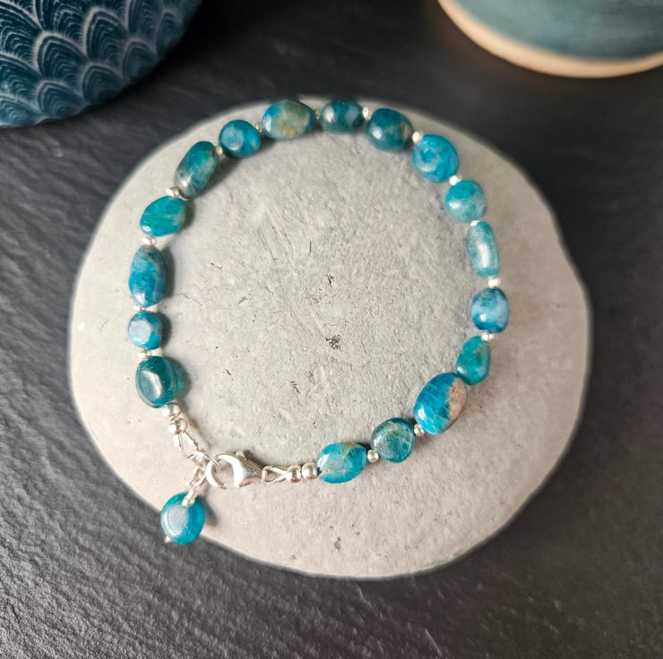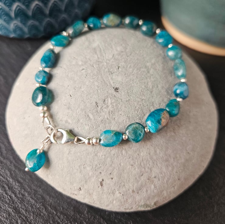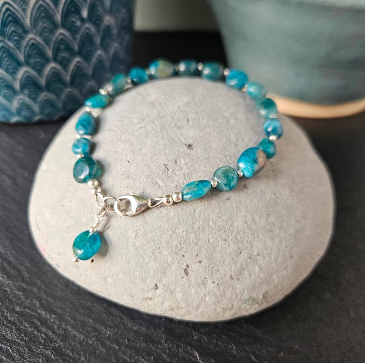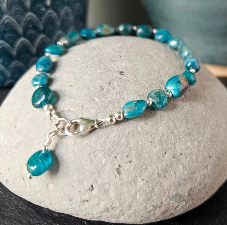 This pretty bracelet is made with natural apatite gemstone beads which are interspersed with small, round sterling silver beads. An additional apatite gemstone hangs next to the clasp as a signature charm. The bracelet fastens with a sterling silver carabiner clasp and is threaded on strong and flexible 49-strand jewellery wire. All the metal components of the bracelet are sterling silver.