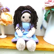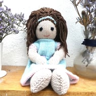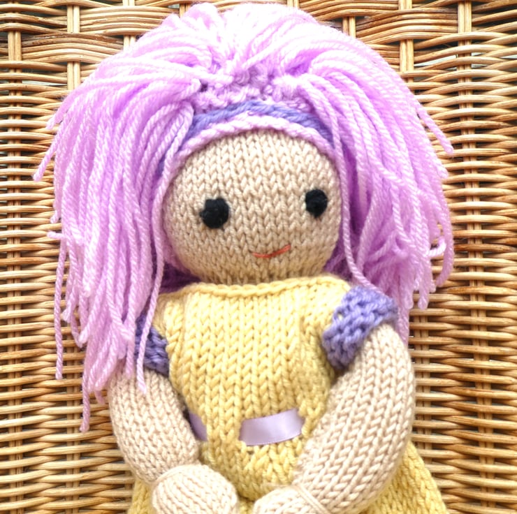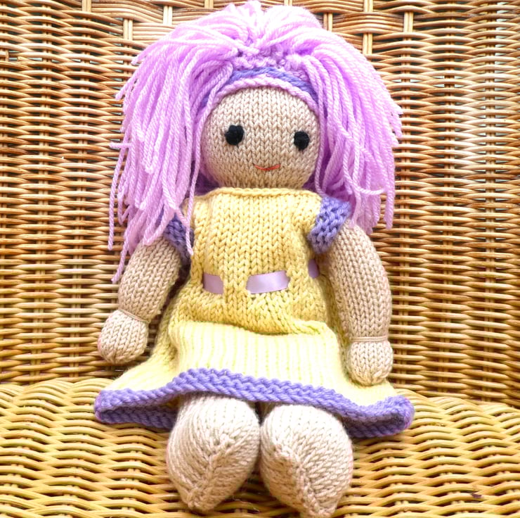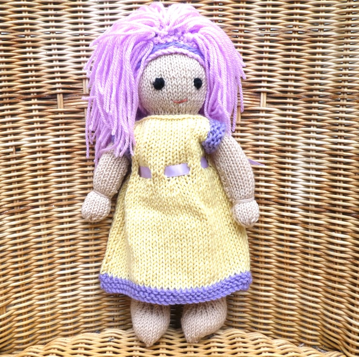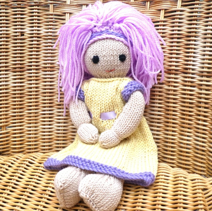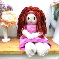 Doll. Hand Knitted Doll 12" Wool Doll with Pink Hair & Removable Dress