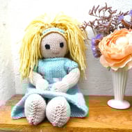This is a gorgeous doll hand-made by me, stitch by stitch (not on a machine). She is made in lovely soft pure wool and she is stuffed with beautiful lambswool. Her pretty removable dress is 100% pure wool and her hair is a soft wool/blend. Each of my dolls is made individually, each one taking me a good two days to produce. This little blond girl is about 30cm (12") tall. She can be gently washed by hand and then squeezed back into shape, or gently wiped down with a damp cloth.