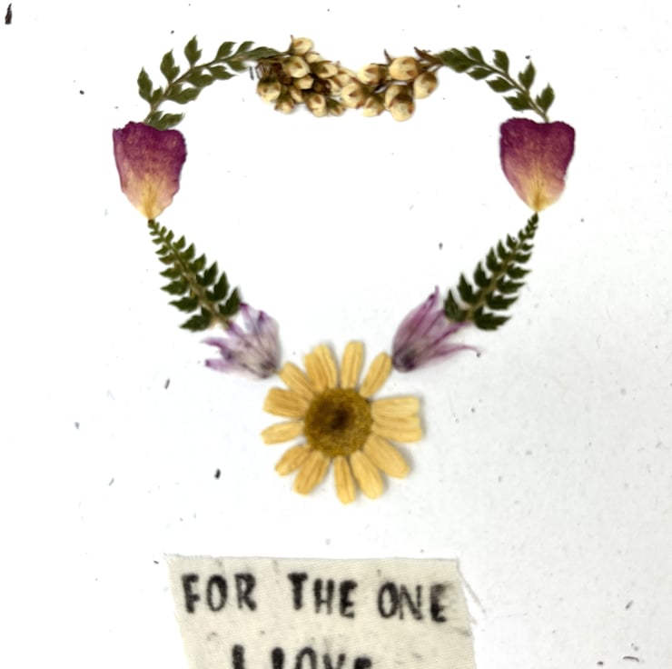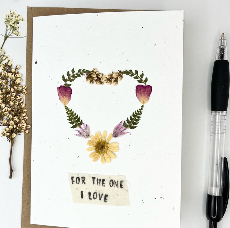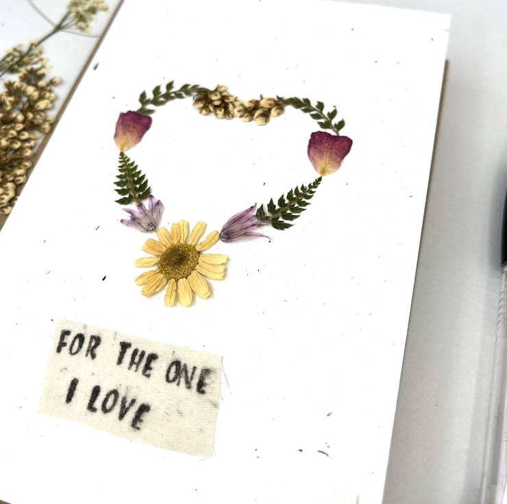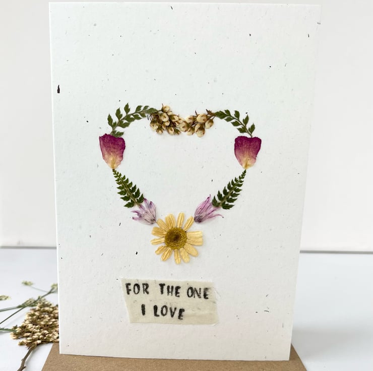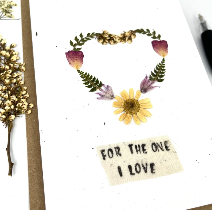 This lovingly handmade real pressed flower greeting card is made using flowers grown in our garden. With a hand printed message of love.