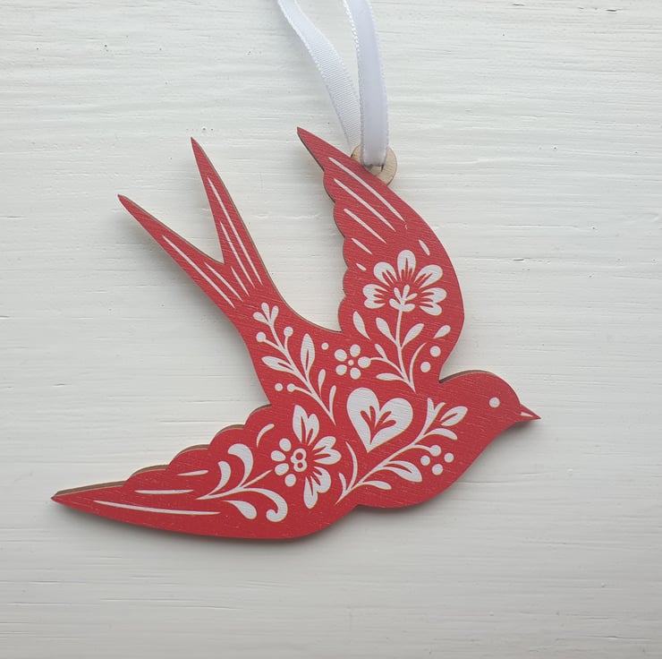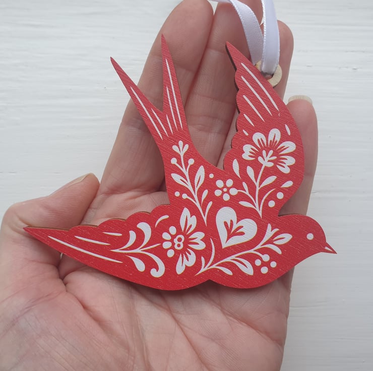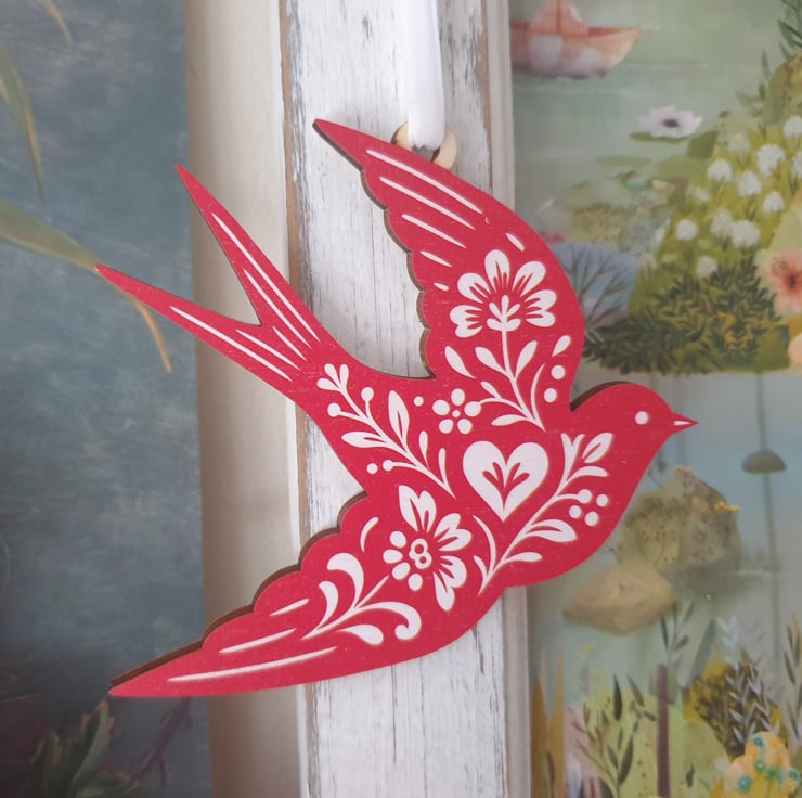 This beautiful wooden Swallow bird has been laser cut from sustainable wood and I've added some white velvet ribbon for it to hang.