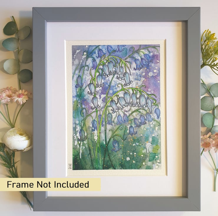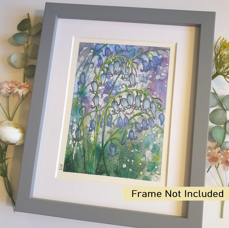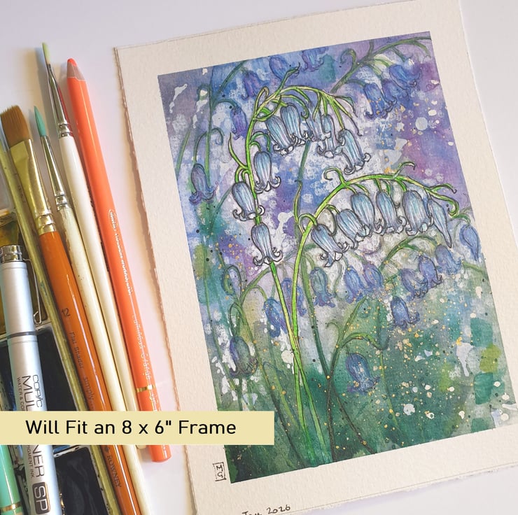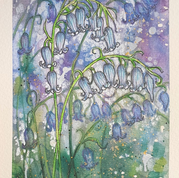 A painting of Scottish bluebell flowers with a background of blue, purple and green patches with splashes of gold.