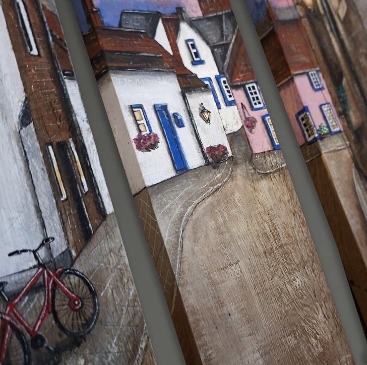 Acriics on wood. three boards connected with the possibility of separating the composition into 3 separate paintings.
