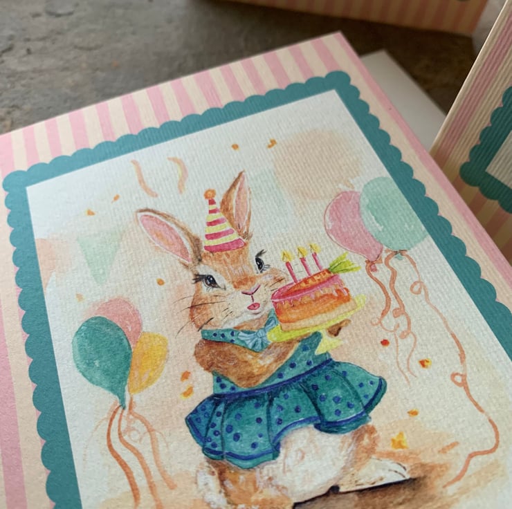 The design shows a bunny dressed up for a party, holding a carrot cake with candles in it, surrounded by balloons and bunting int he background – perfect for Birthday, anniversaries, celebration card or even as an invitation.