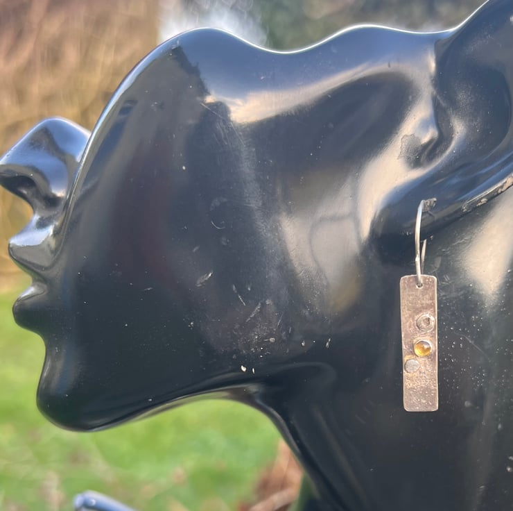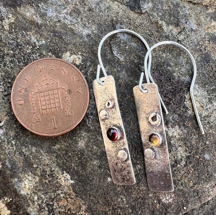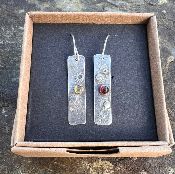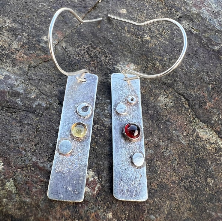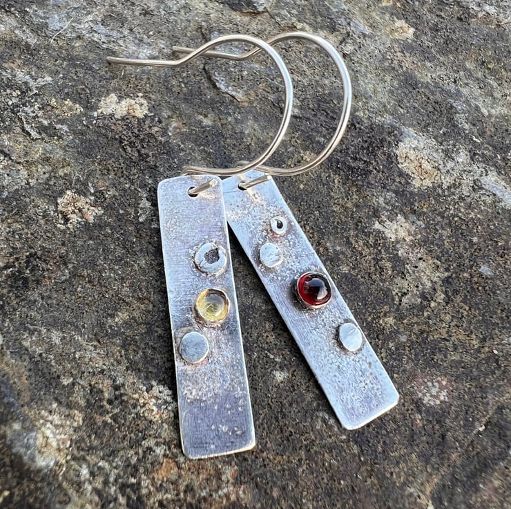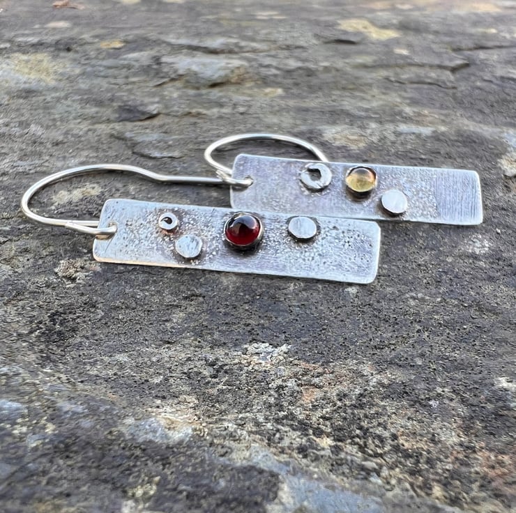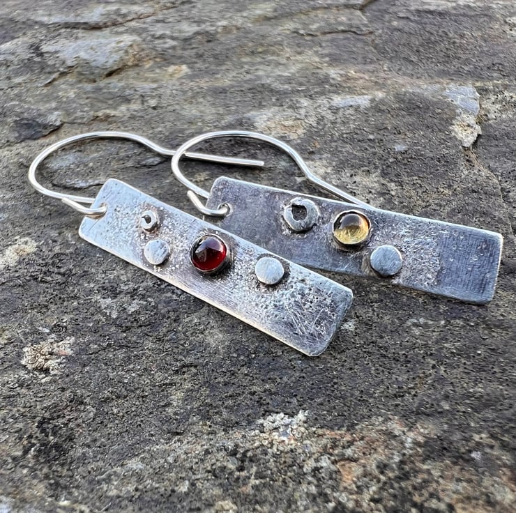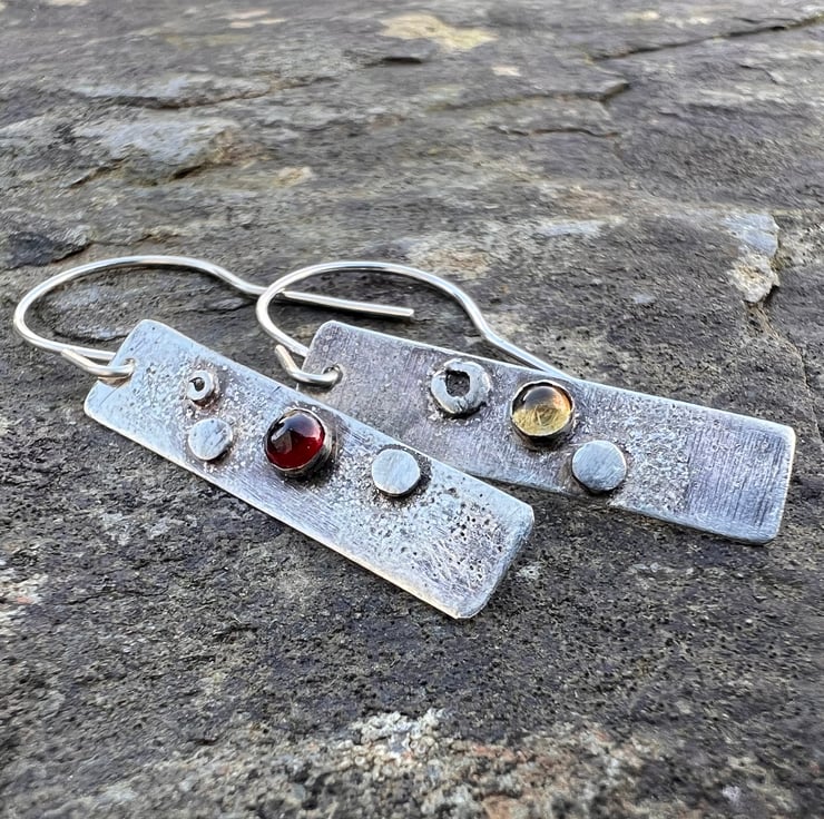 Mismatched sterling silver textured rectangular dangle earrings with a deep red garnet set into one and a golden yellow Citrine set into the other. The textures have been achieved with bits of left over silver, which give an aged look. . The total length of the dangle from the top of the handmade sterling silver ear hook is 39mm/ 1.5 inches.